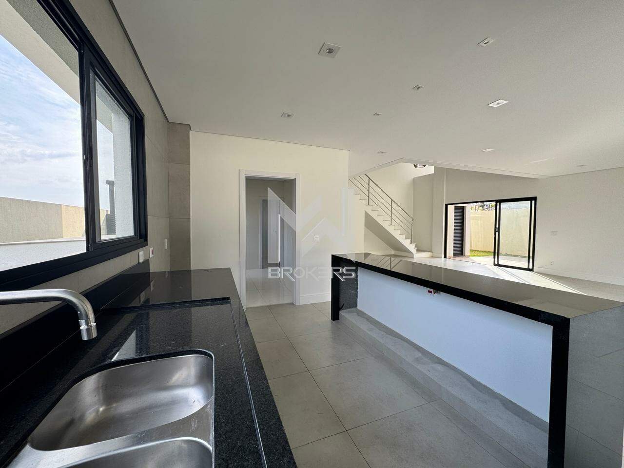 Sala três ambientes com pé direito alto, lavabo, escritório, cozinha, área de serviços com dependência de doméstica (dormitório e banheiro) e suíte no térreo.