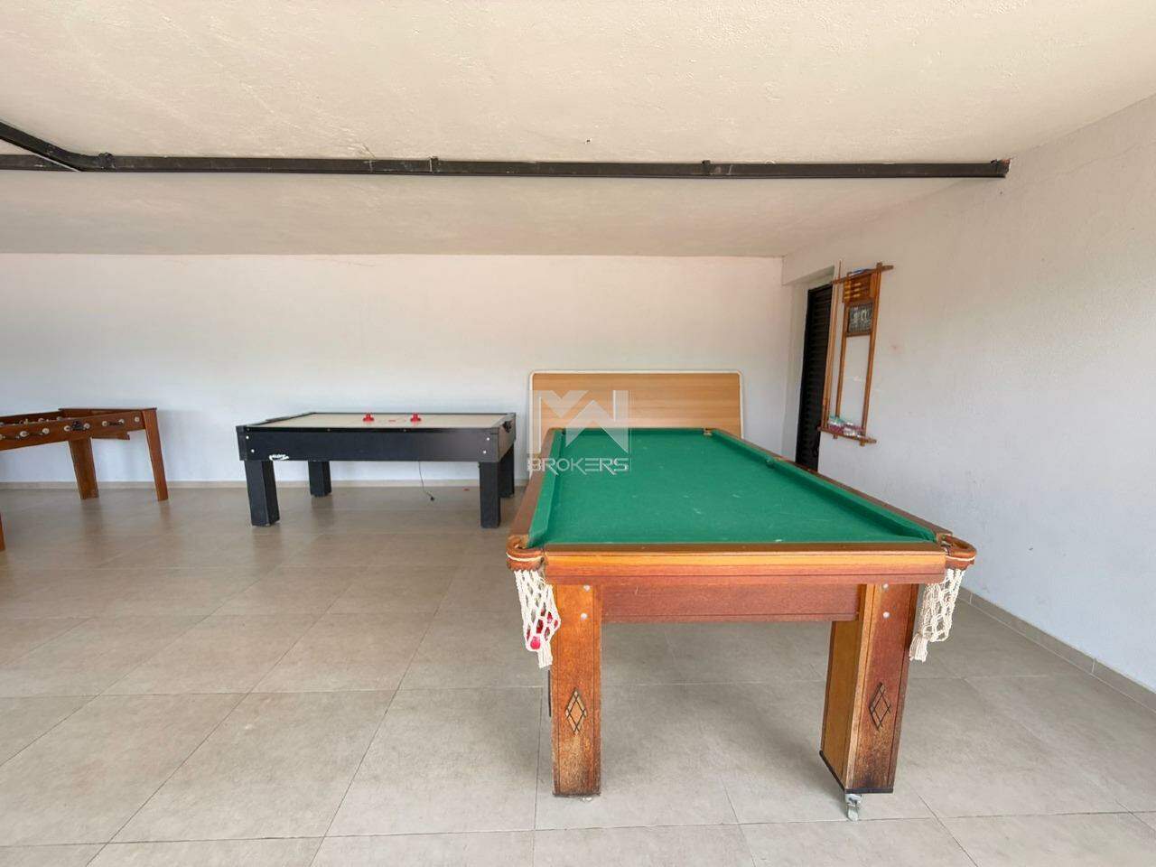 Sala dois ambientes com aquário, sala de TV com lavabo, cozinha com armários, área de serviços e suíte de doméstica.