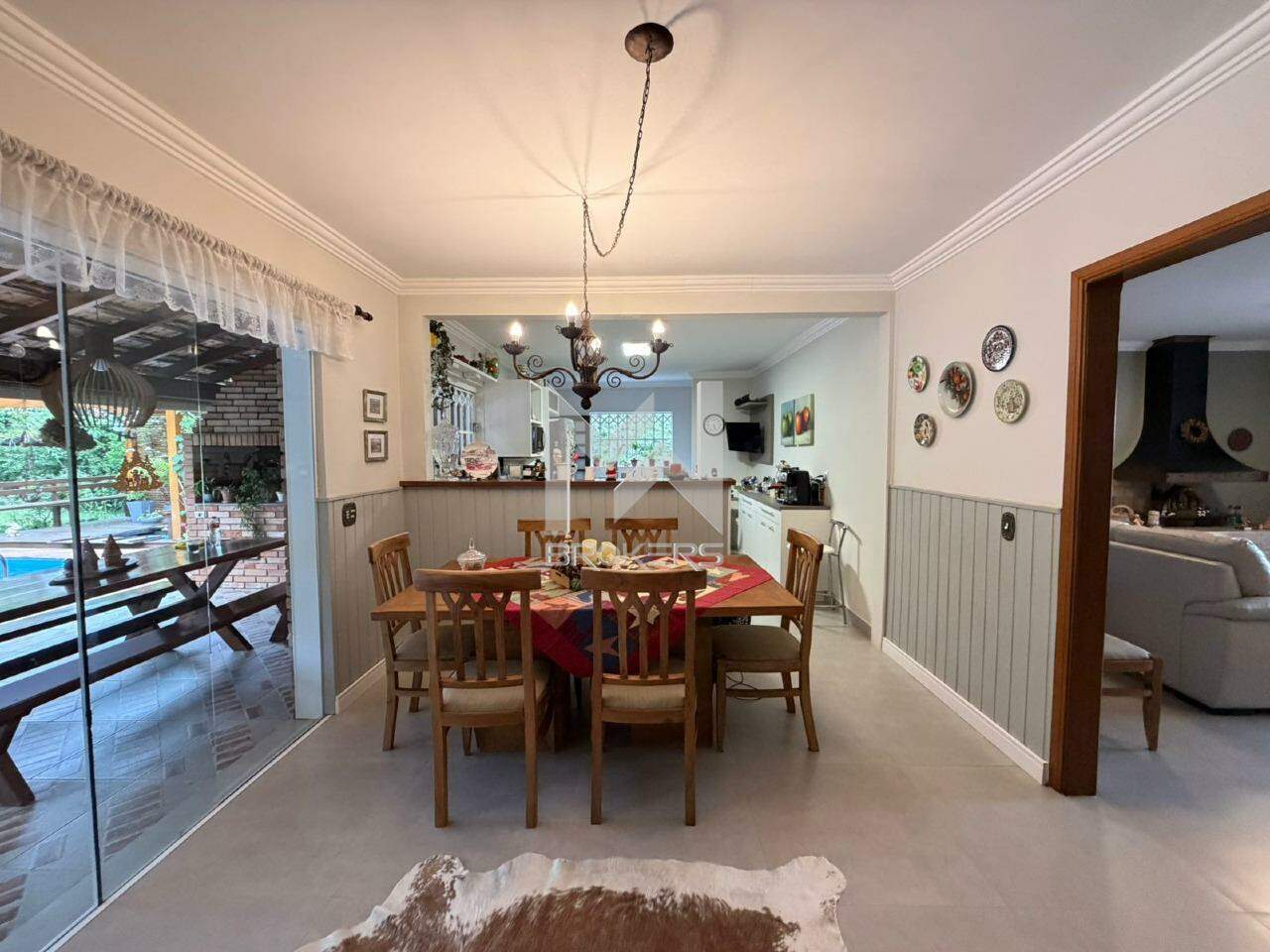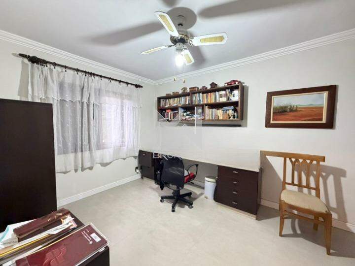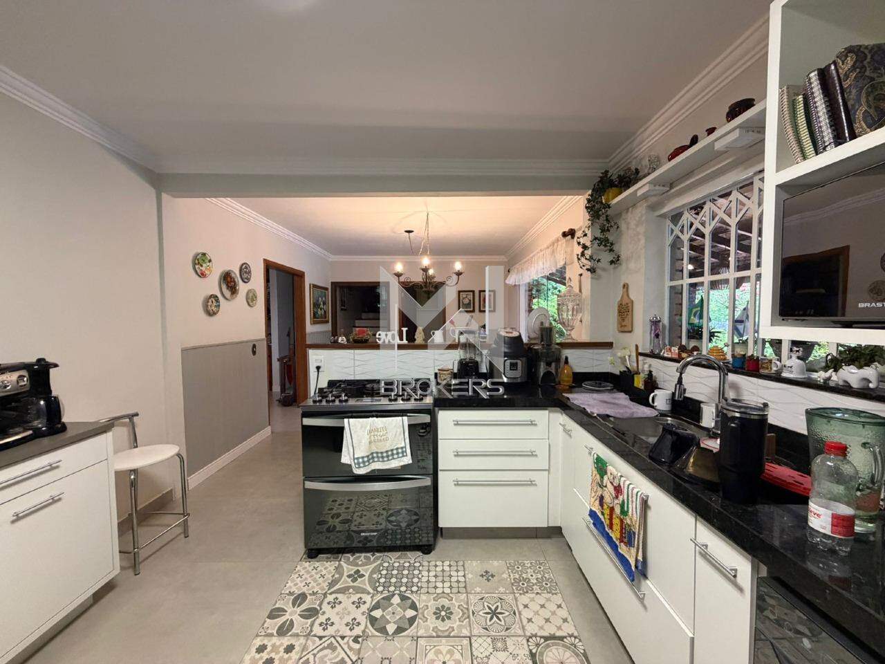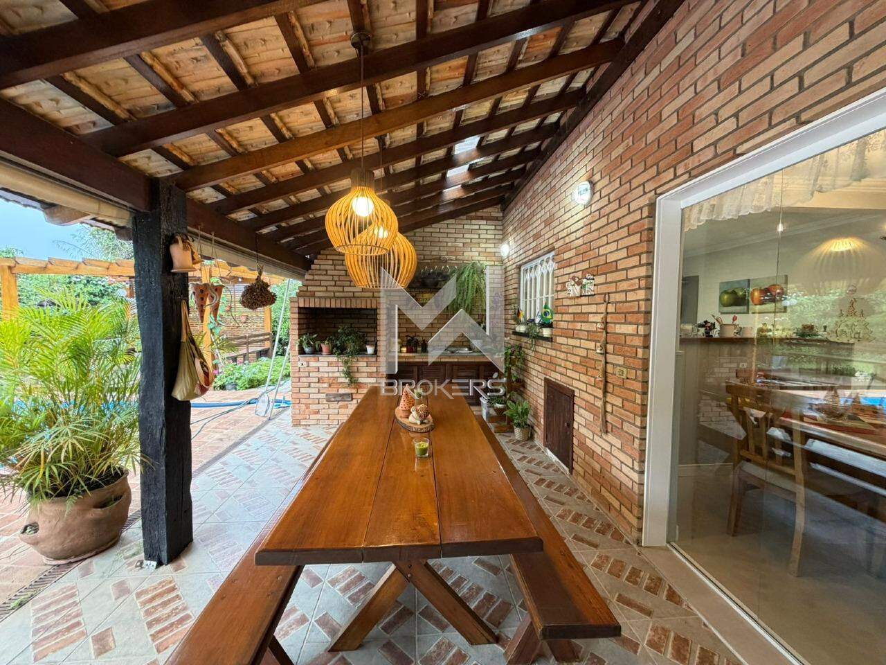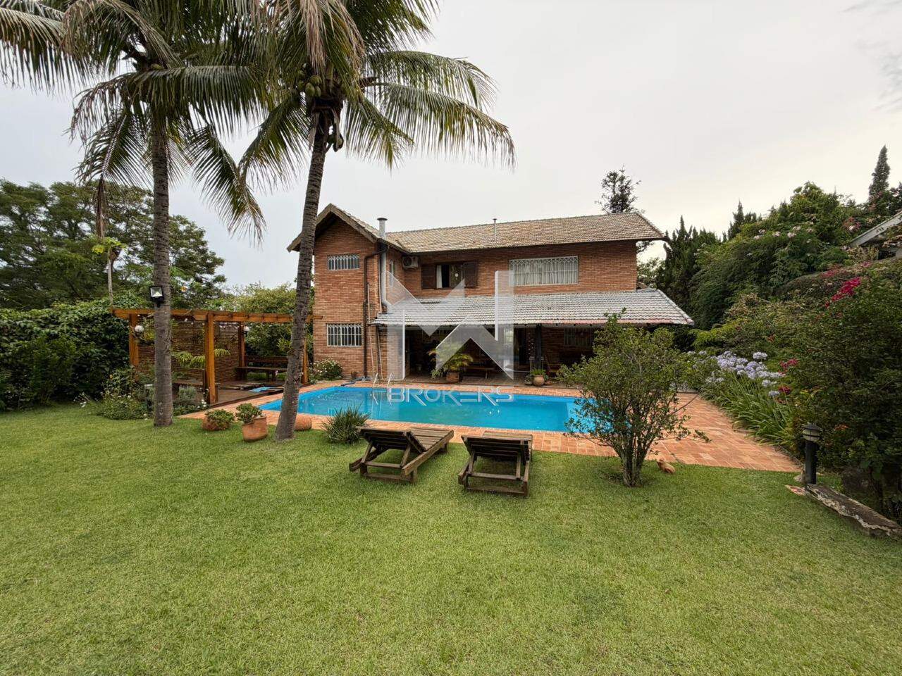 Casa com arquitetura alemã. Sala de estar com lareira, escritório reversível em dormitório, lavabo, segundo escritório, cozinha integrada à sala de refeições, despensa, área de serviços e depósito.