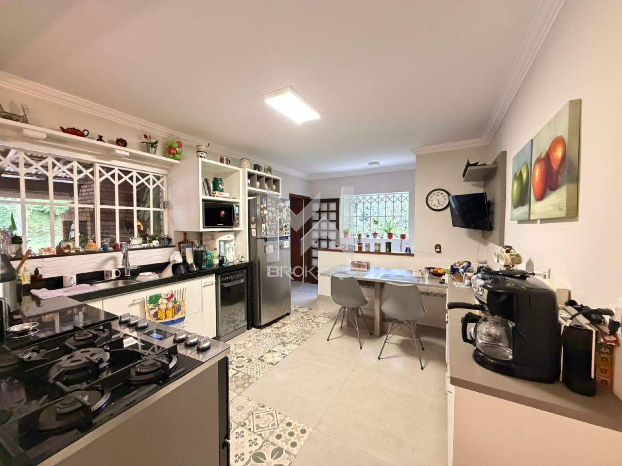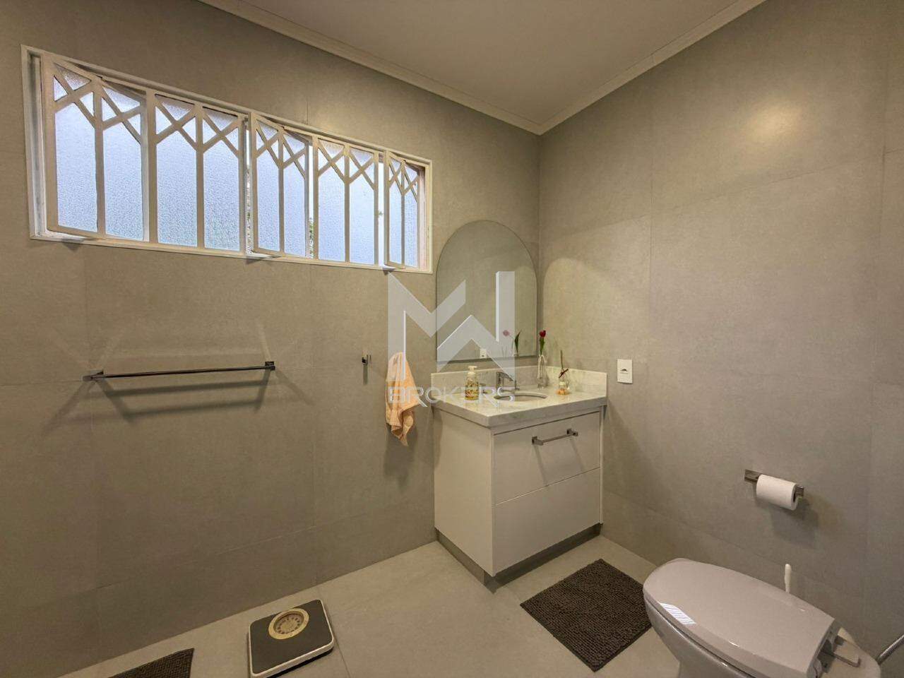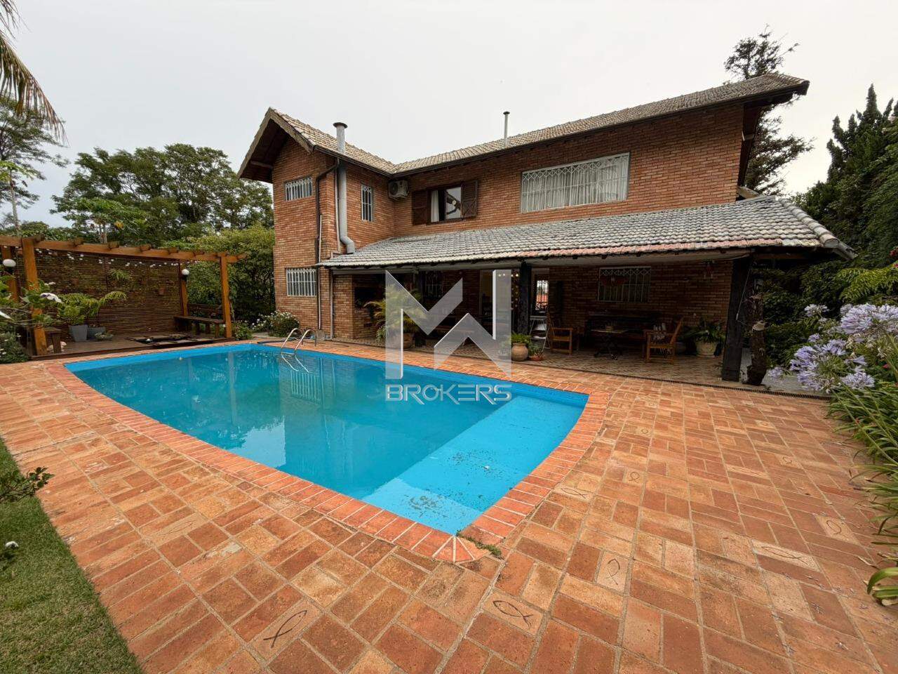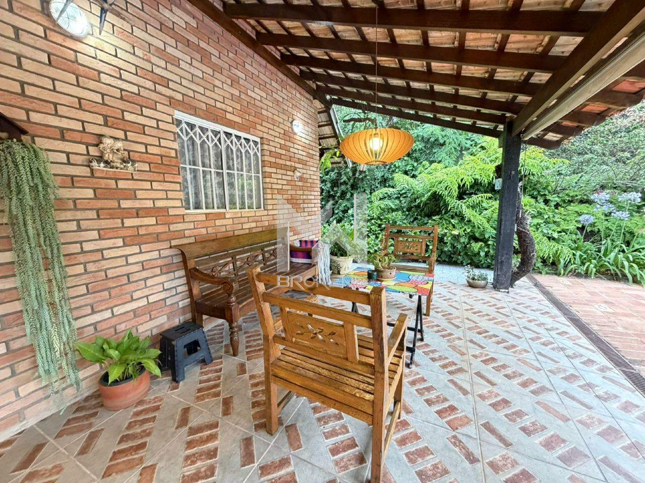 Casa com arquitetura alemã. Sala de estar com lareira, escritório reversível em dormitório, lavabo, segundo escritório, cozinha integrada à sala de refeições, despensa, área de serviços e depósito.