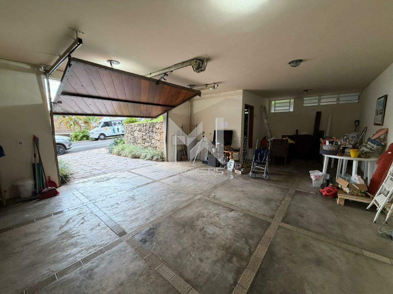 Garagem coberta pra 02 carros e uma moto, com depósito e suíte de serviços.