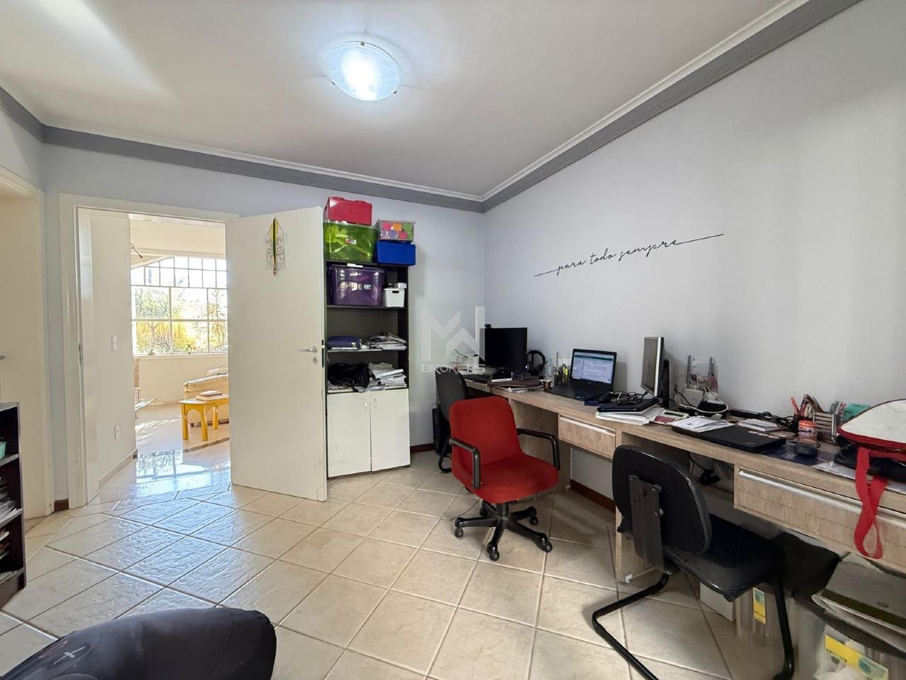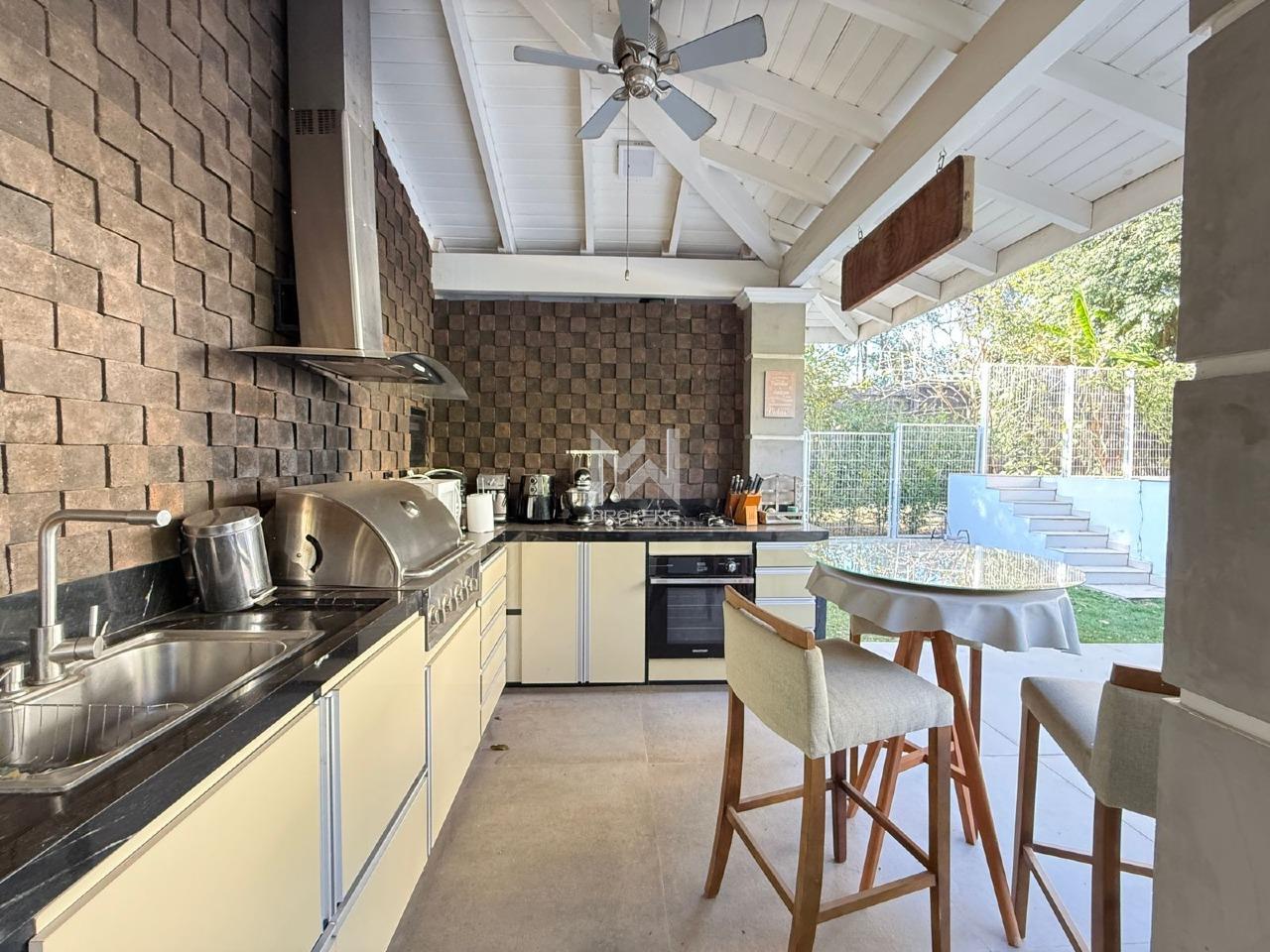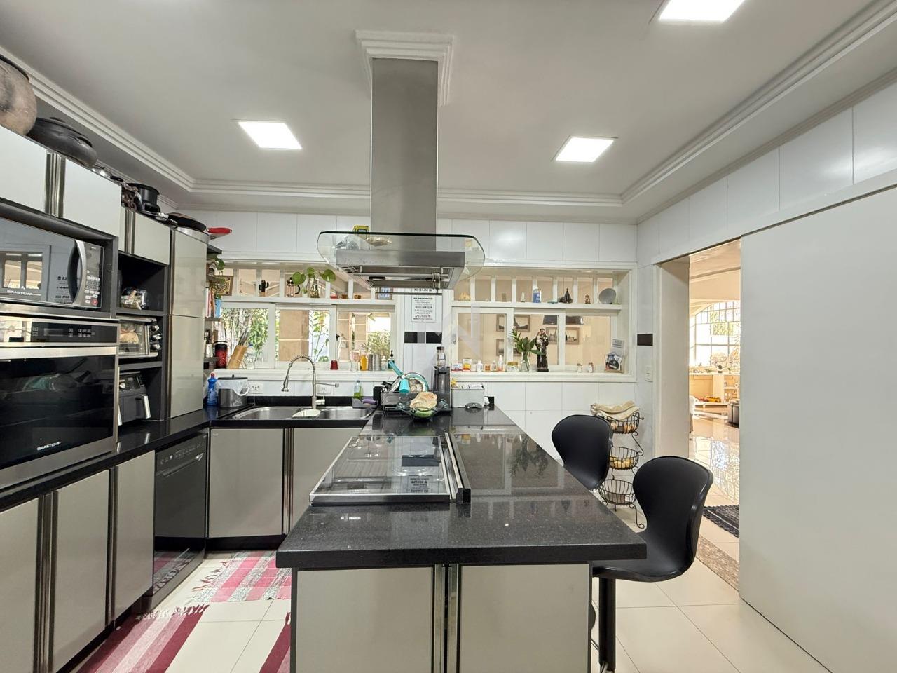 Sala de estar, sala de lareira e sala de refeições integradas, lavabo, home office reversível para suíte no térreo. Cozinha planejada, despensa, área de serviços com armários, área apoio externo e dormitório de doméstica com banheiro.