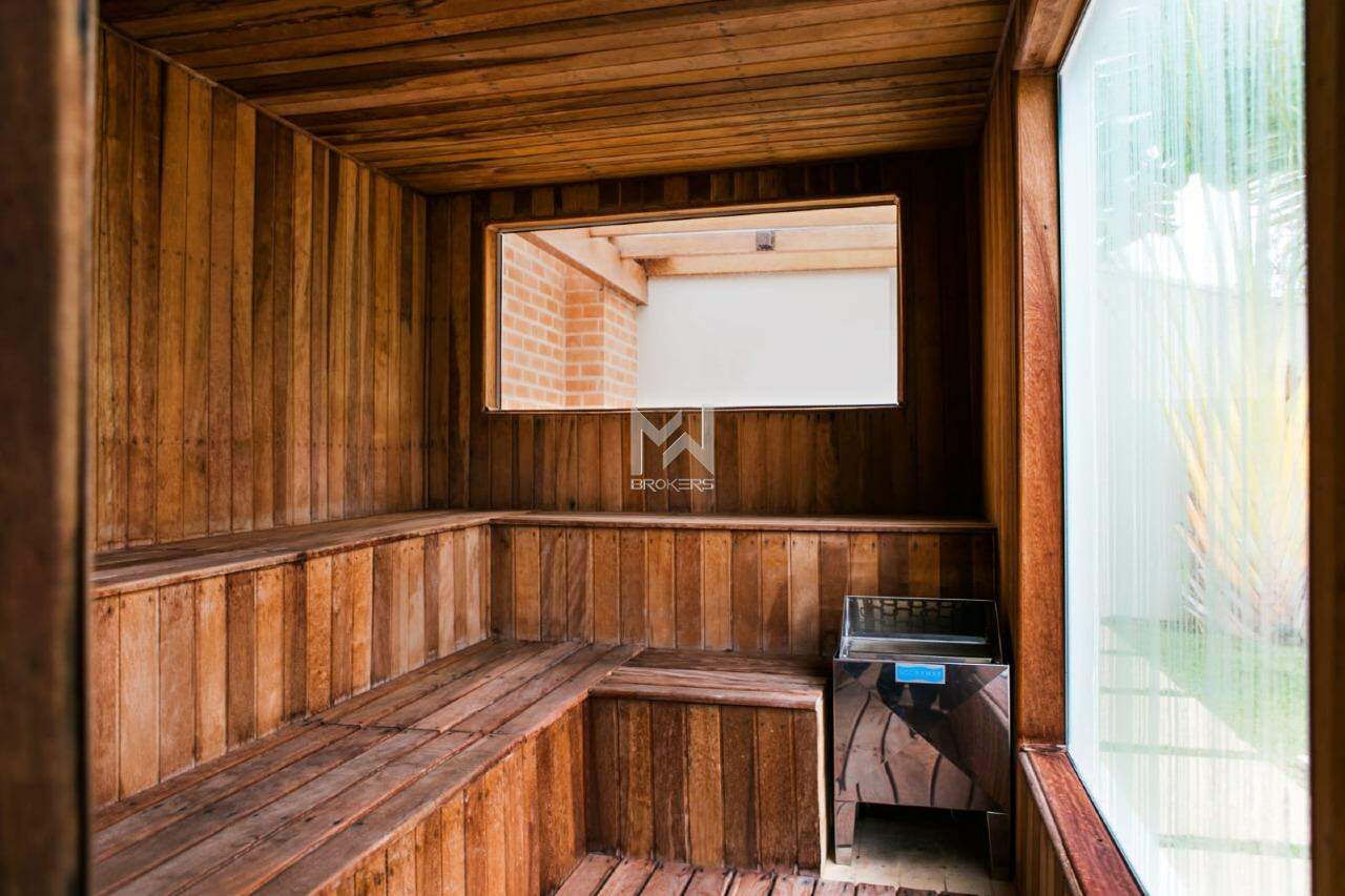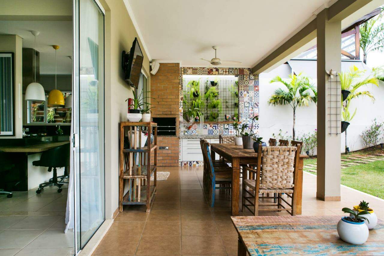 Nos fundos, varanda gourmet com churrasqueira, área gramada, piscina com prainha e edícula com espaço lounge, banheiro de apoio e sauna seca.