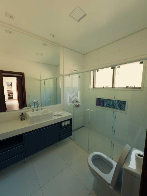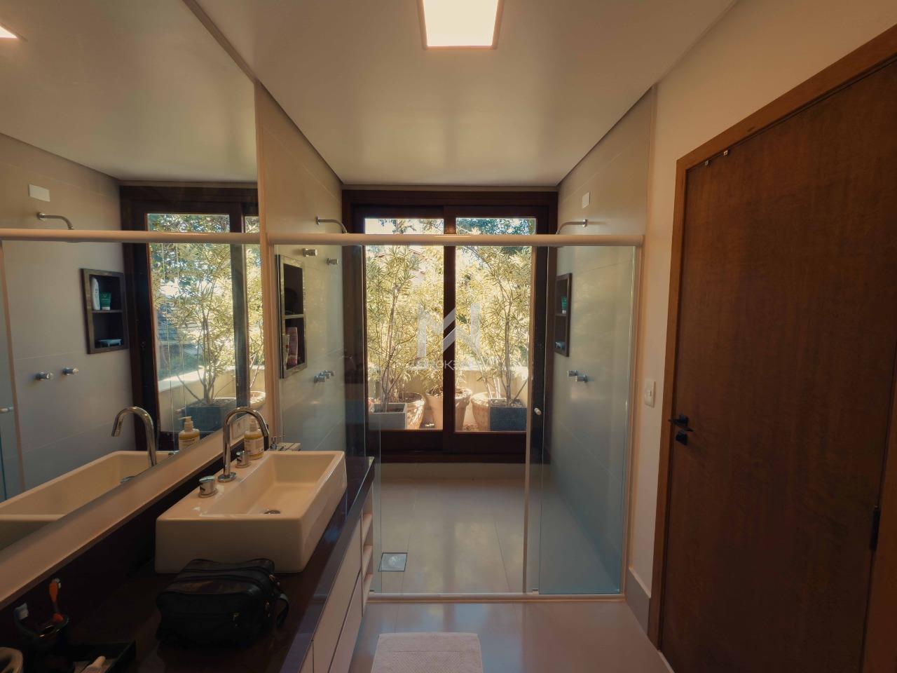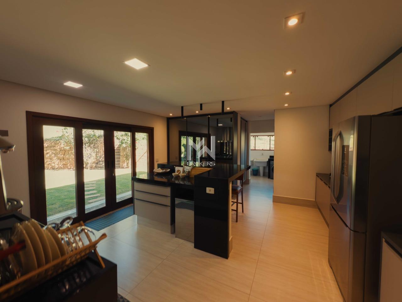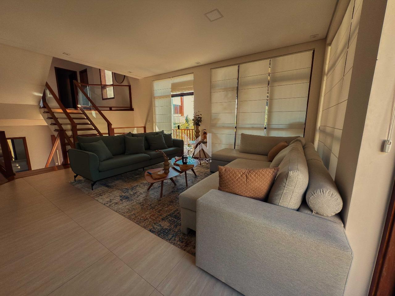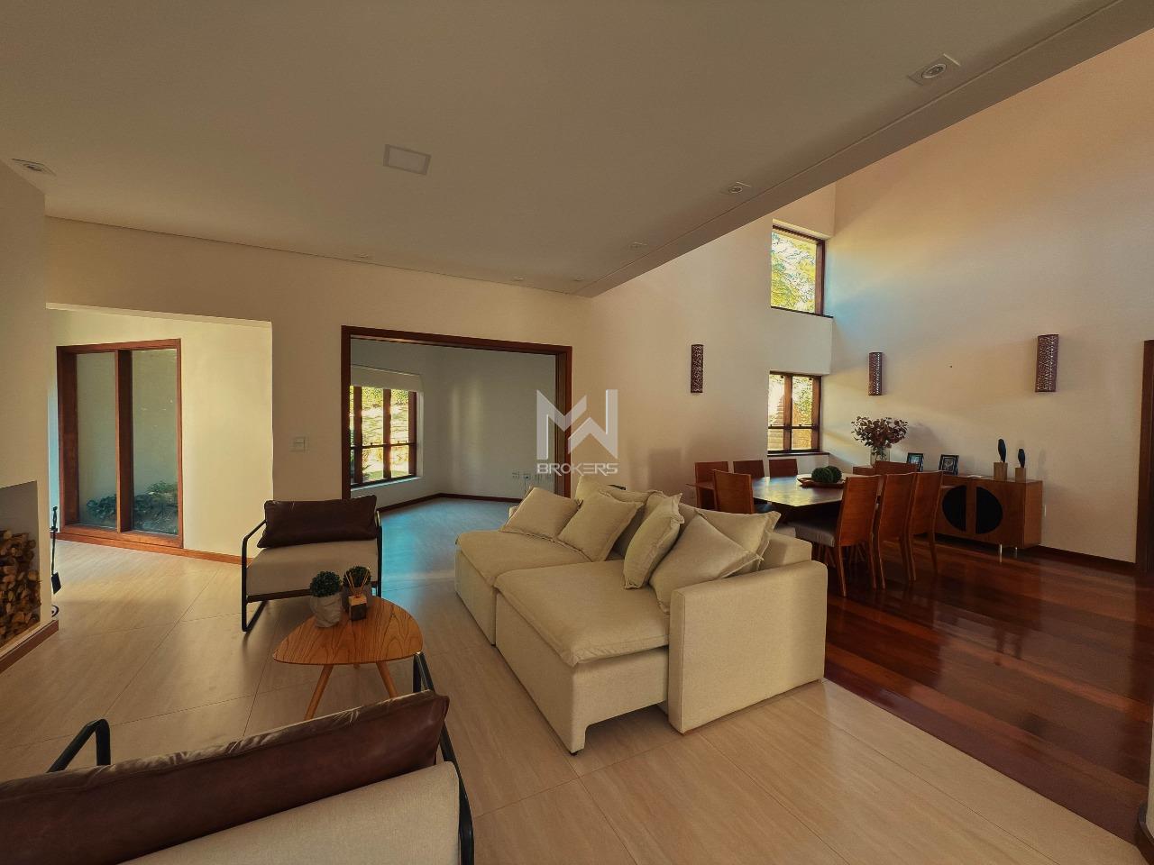 Ao entrar, você é recebido por um living com pé-direito elevado e capacidade para três ambientes, com lareira e conexão direta com o jardim. Um mezanino aconchegante abriga a sala de TV, perfeita para momentos em família. A cozinha é espaçosa e planejada, equipada com ilha, cristaleira e despensa. A casa conta ainda com dois lavabos, área de serviço e projeto luminotécnico completo.