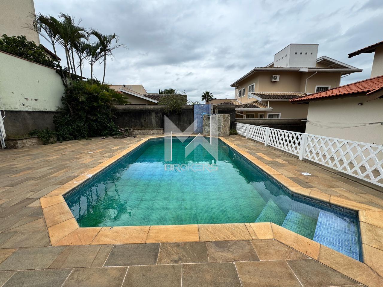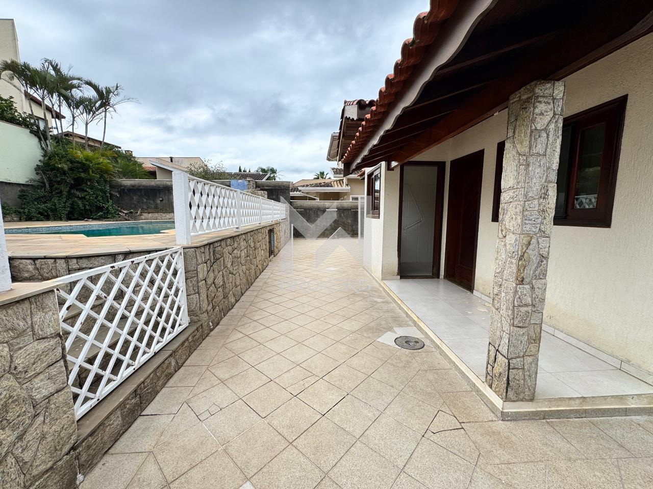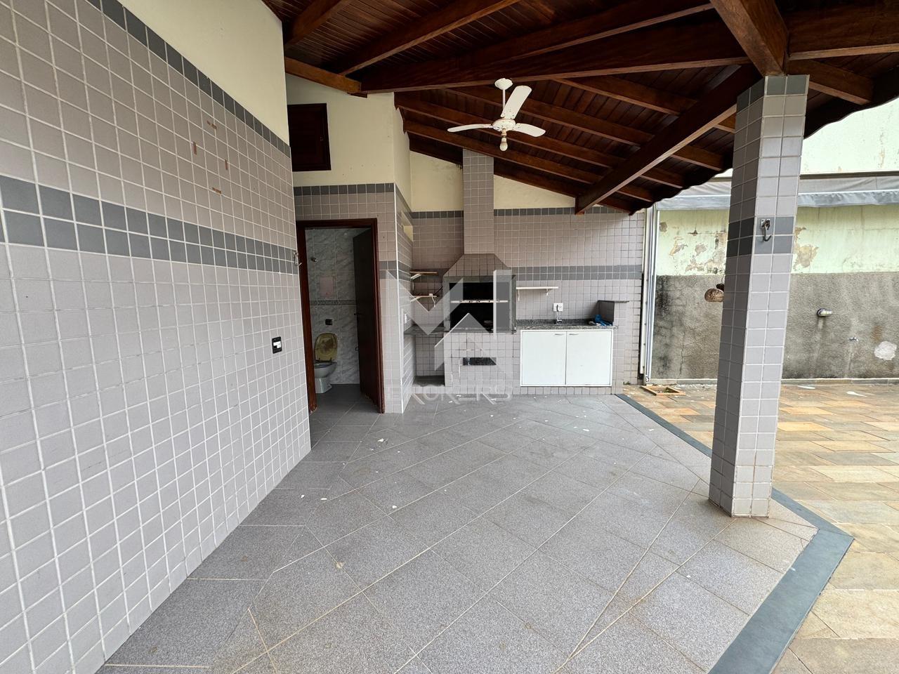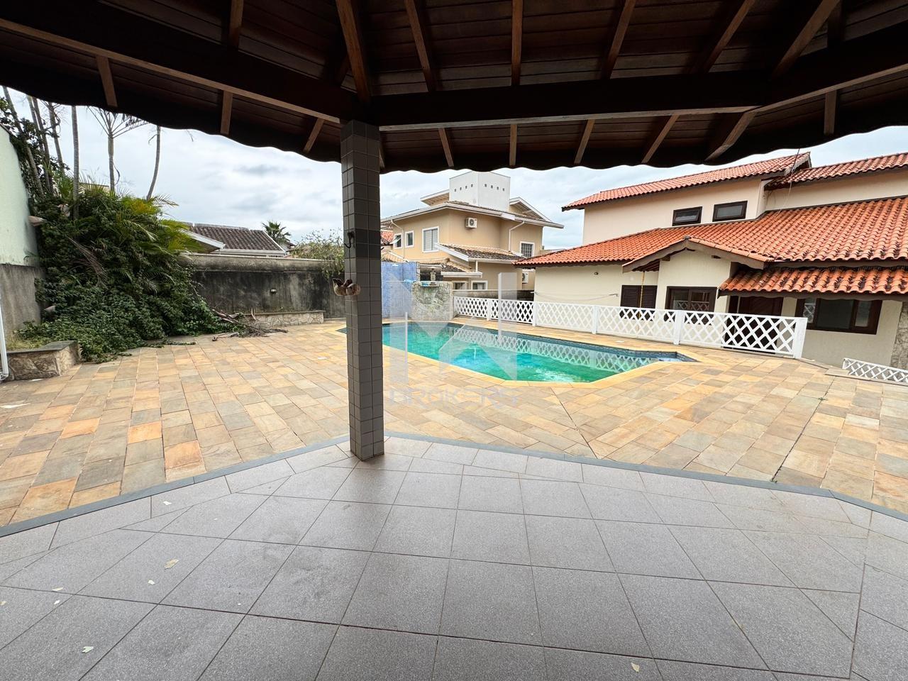 Casa para alugar com uma sala com lareira, sala de jantar, cozinha, área de serviço, área gourmet com churrasqueira, quintal e piscina.
