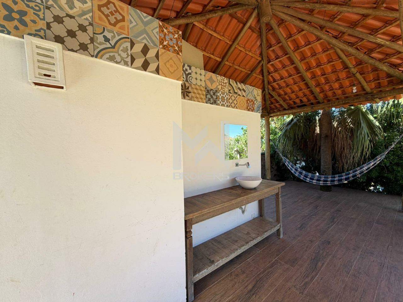 Nos fundos, área gourmet com churrasqueira, banheiro, piscina, gramado e quiosque.