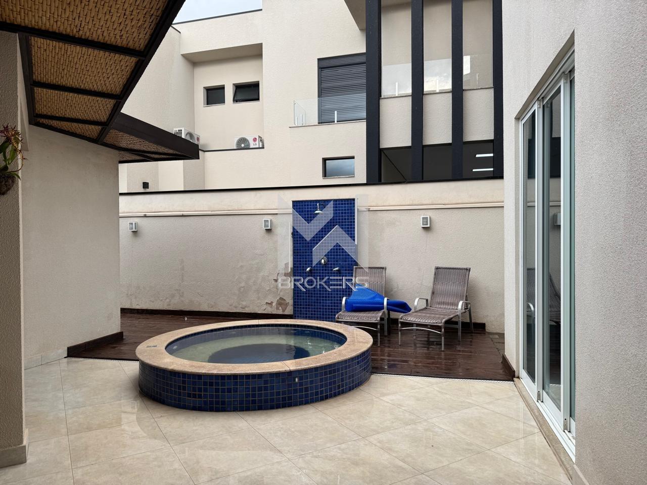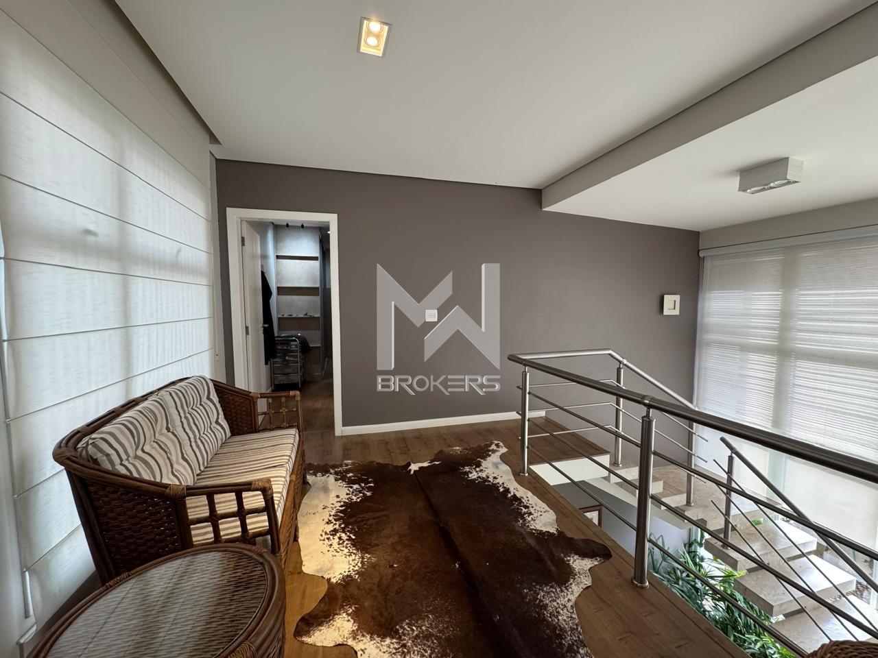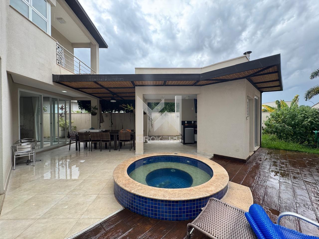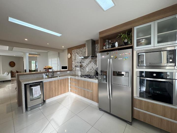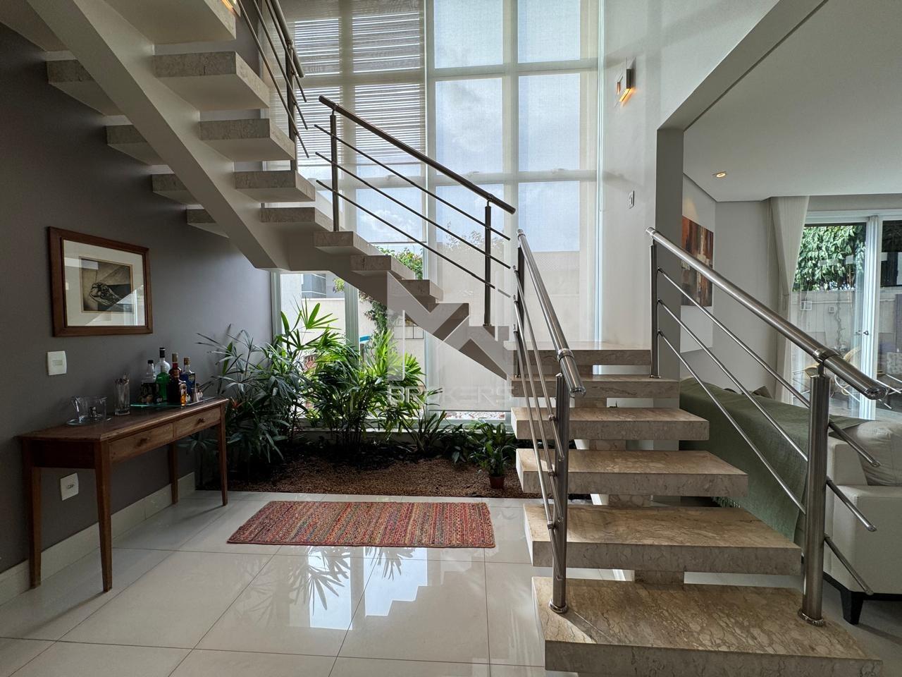 Salas de estar e de refeições integradas, lavabo, sala de TV, escritório fechado, cozinha americana com despensa, área de serviços e 03 dormitórios, todos suítes, sendo uma no térreo.