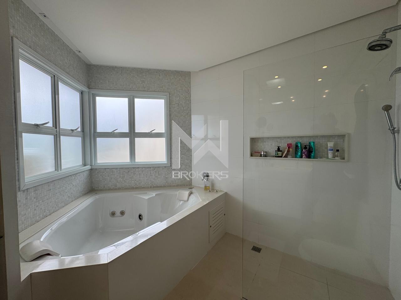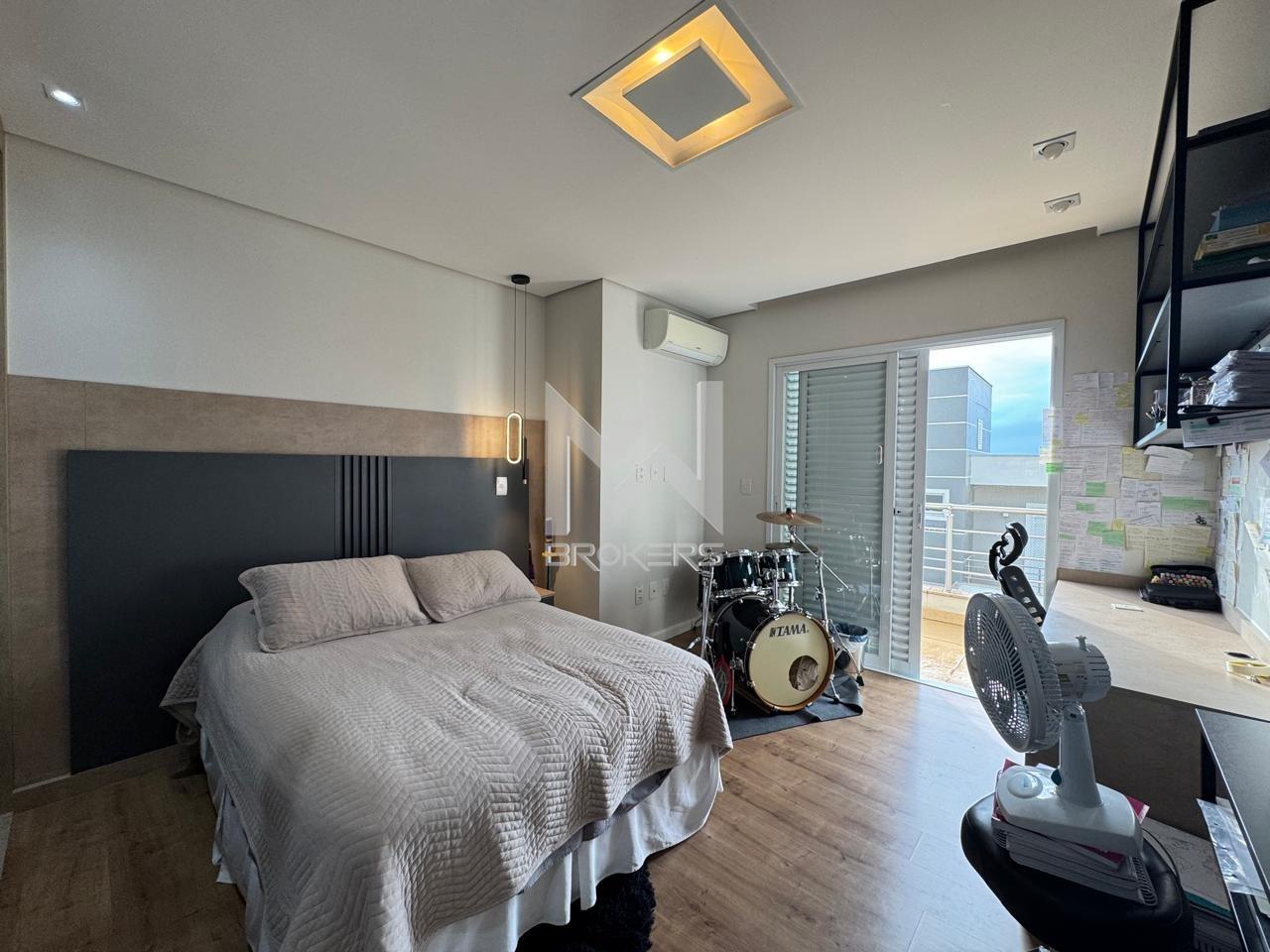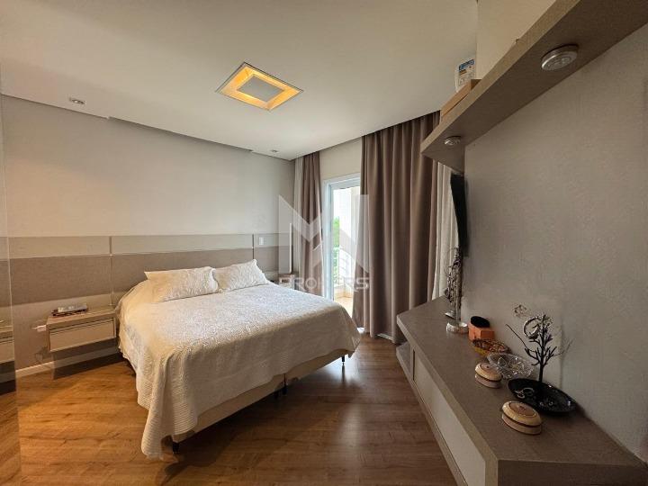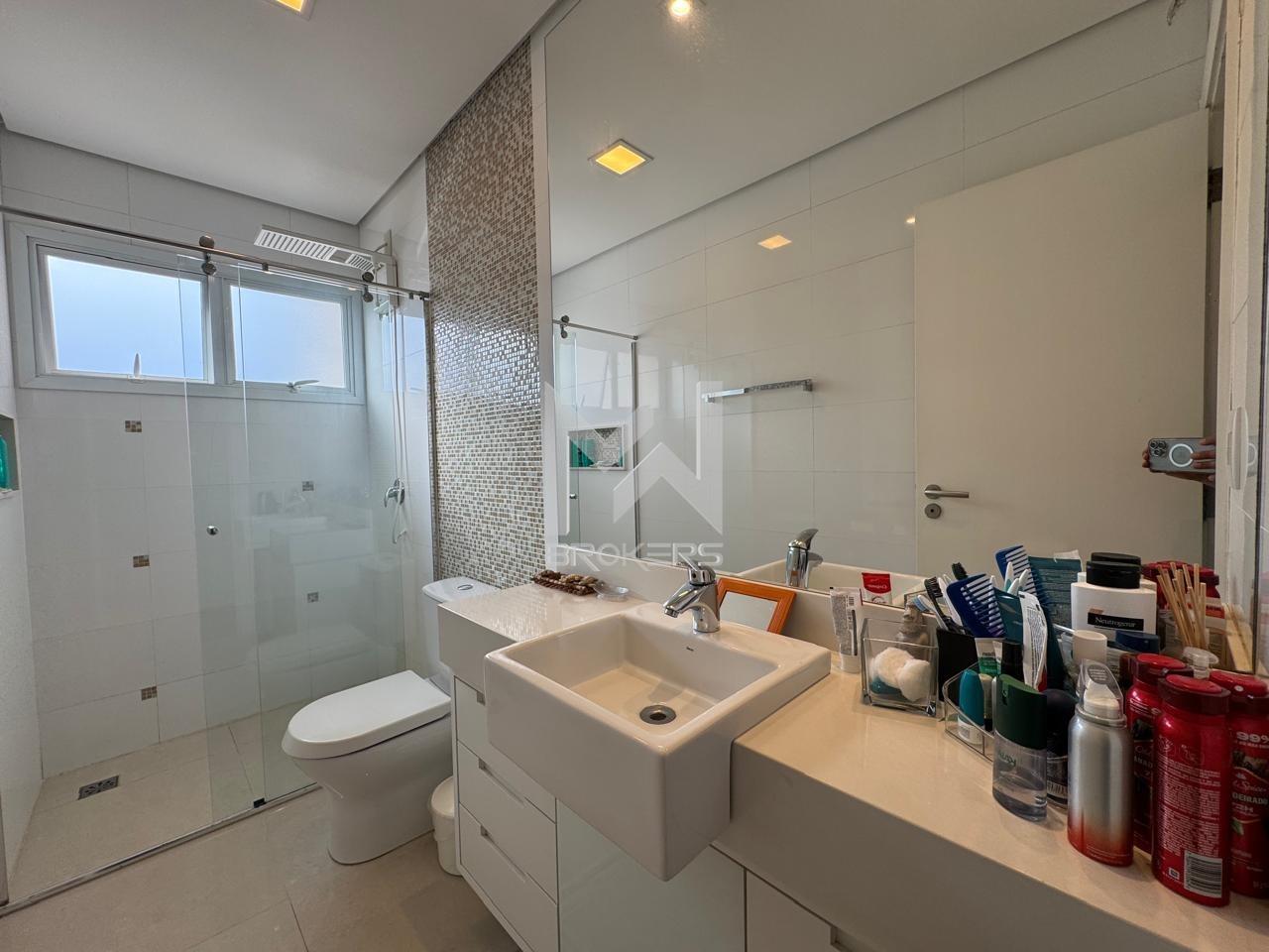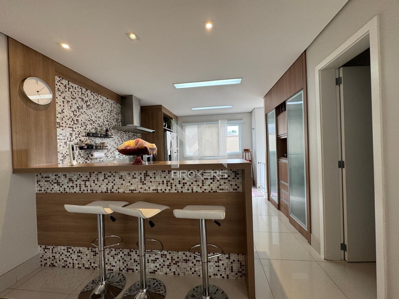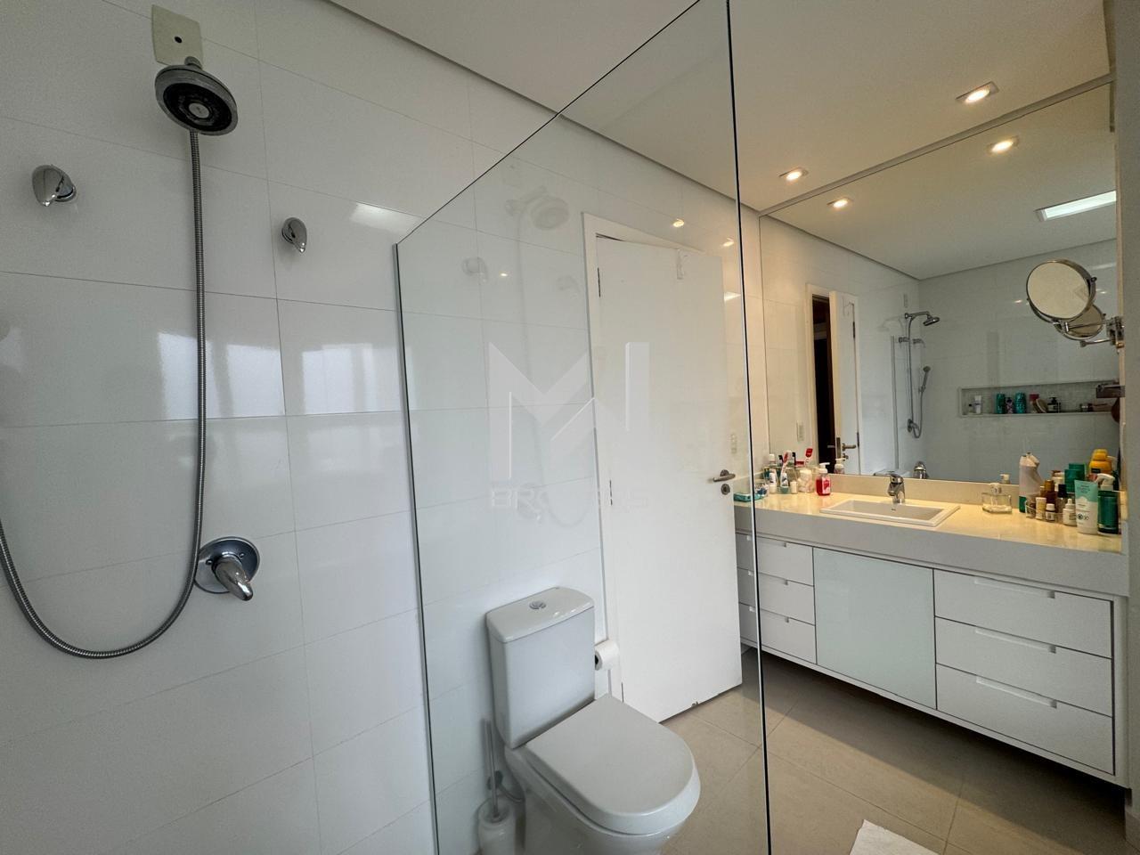 Salas de estar e de refeições integradas, lavabo, sala de TV, escritório fechado, cozinha americana com despensa, área de serviços e 03 dormitórios, todos suítes, sendo uma no térreo.