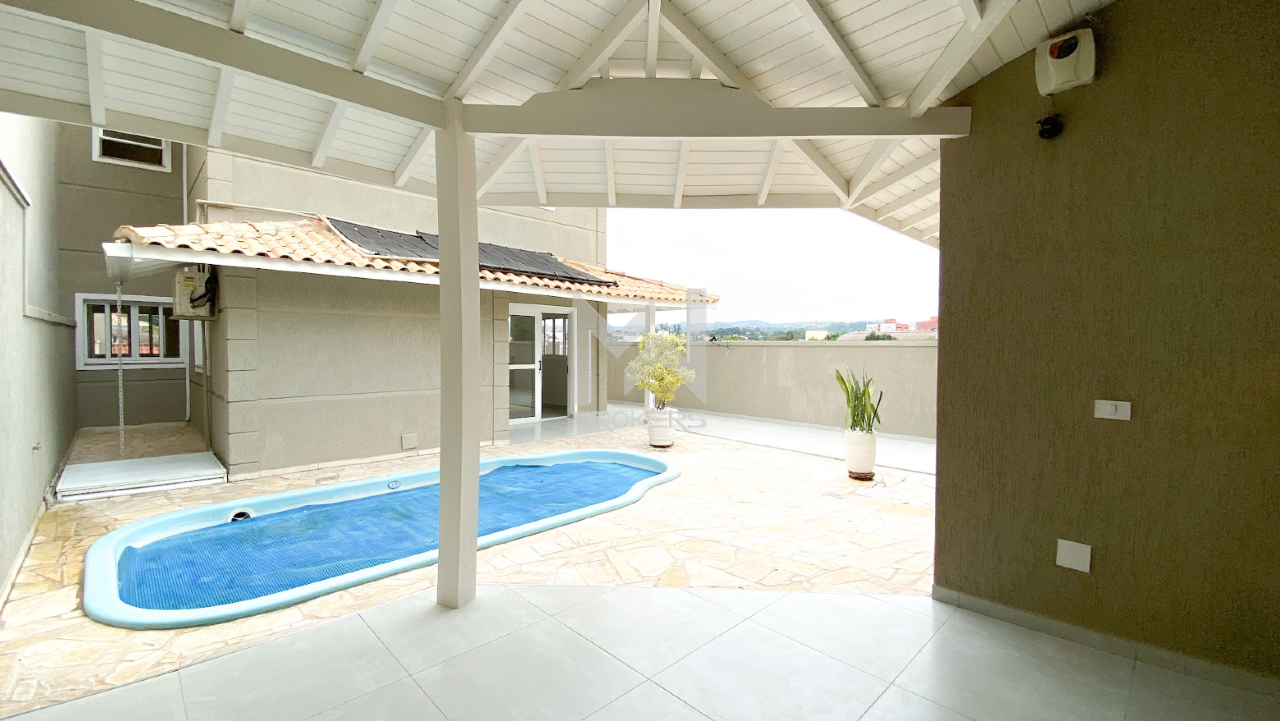 Sala de estar, sala de refeições e sala de TV, lavabo, escritório, lavabo, quintal com piscina e área gourmet.