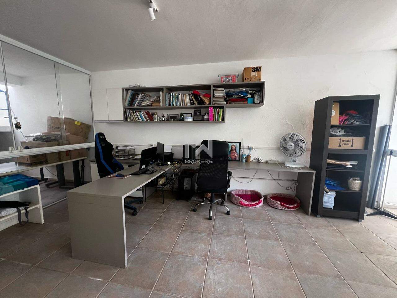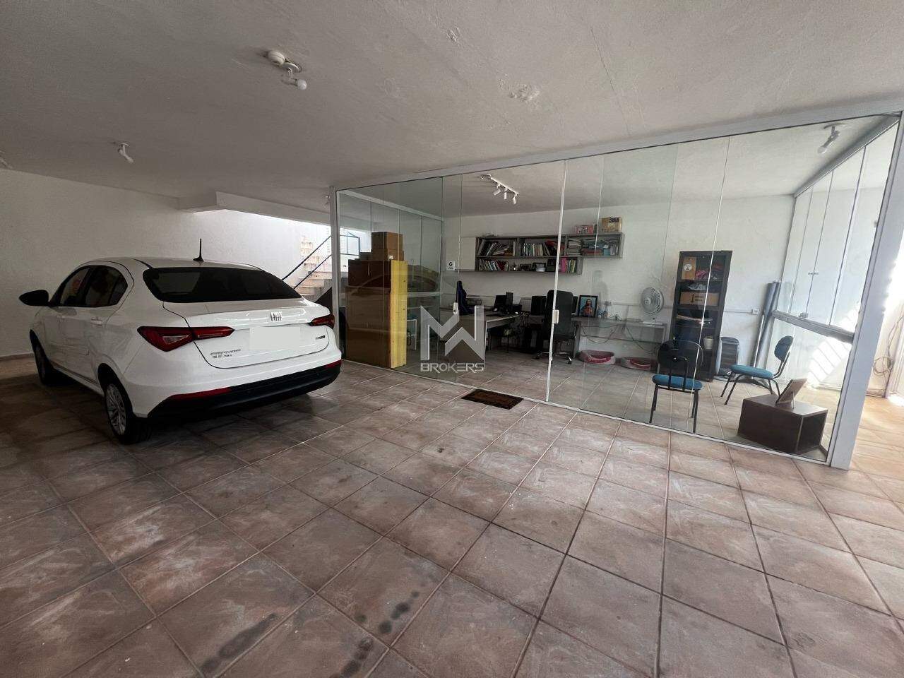 A garagem fica no pavimento inferior, com escritório fechado em vidro.