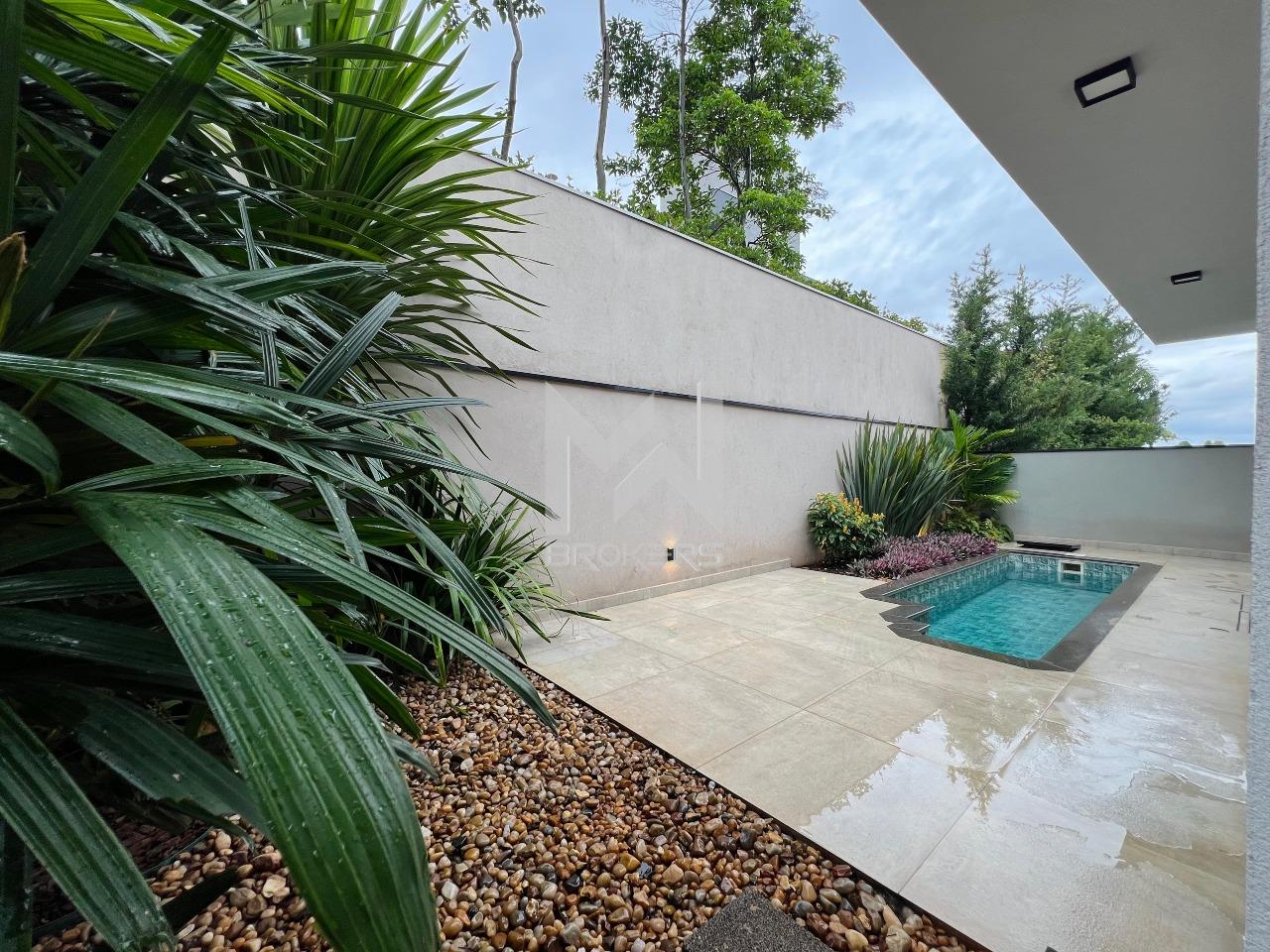 Para os momentos de lazer e entretenimento, a casa possui um espaço gourmet interno, com sala e banheiro, e um espaço externo com piscina e jardim.