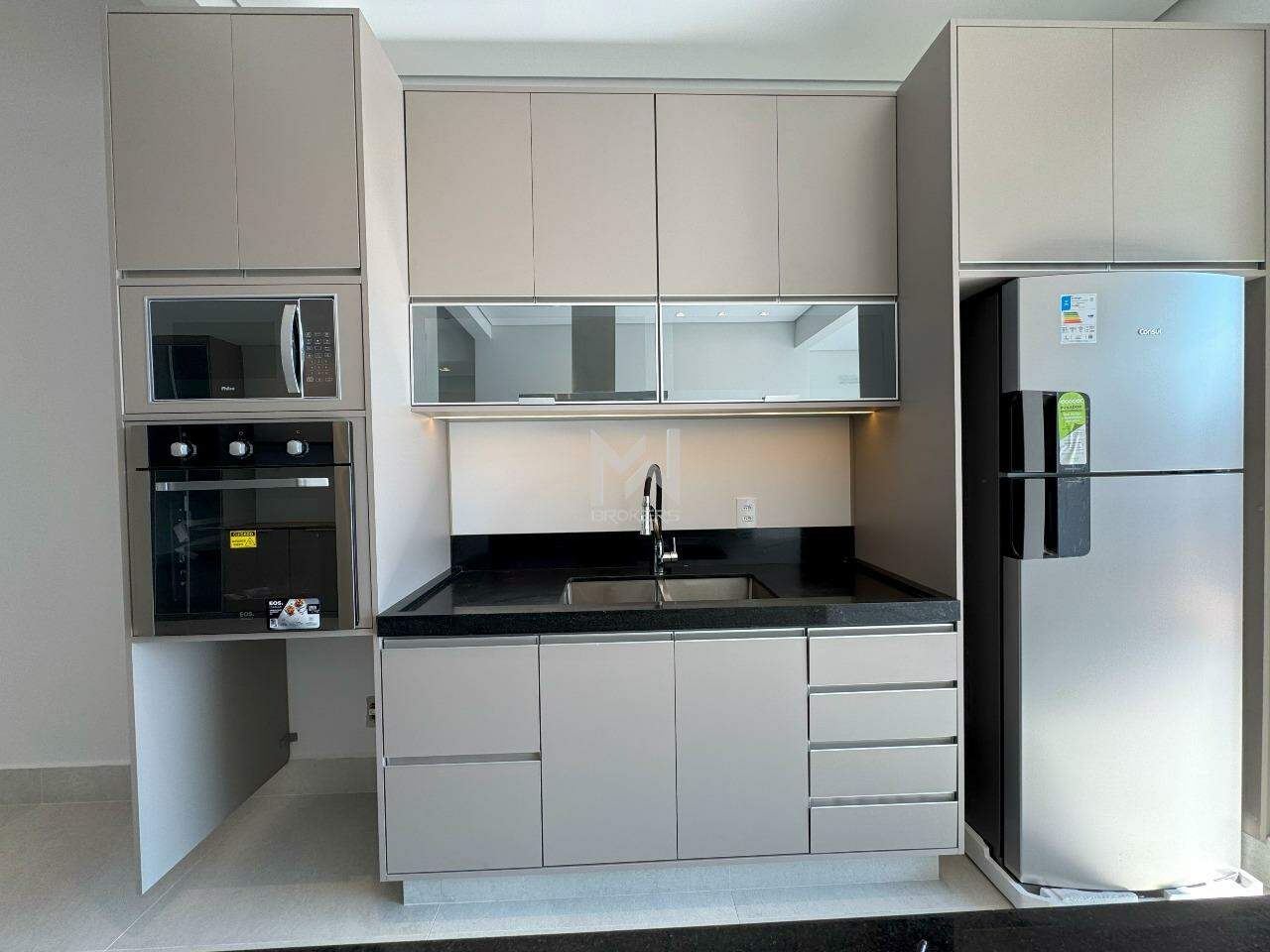 - Living com pé-direito duplo, integrado à cozinha com ilha em pedra preta acetinada, equipada com fogão, coifa, forno, microondas e geladeira;