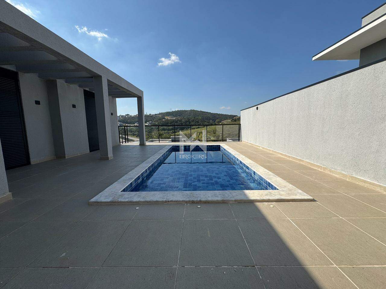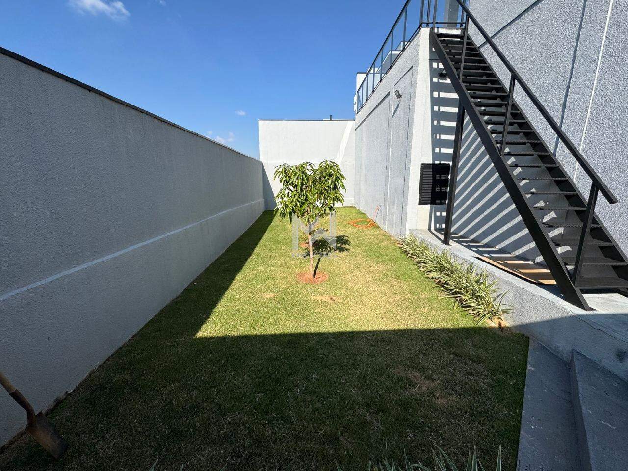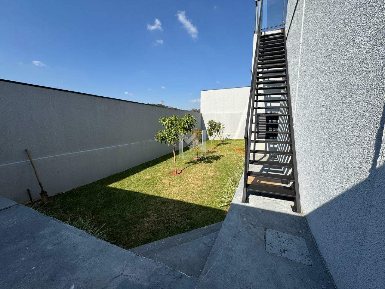 Quintal com piscina e gramado no pavimento inferior.
