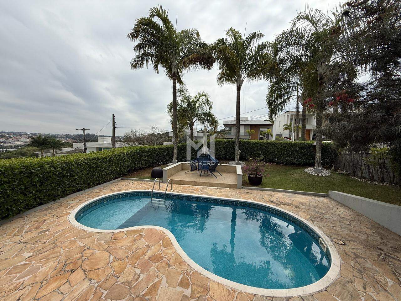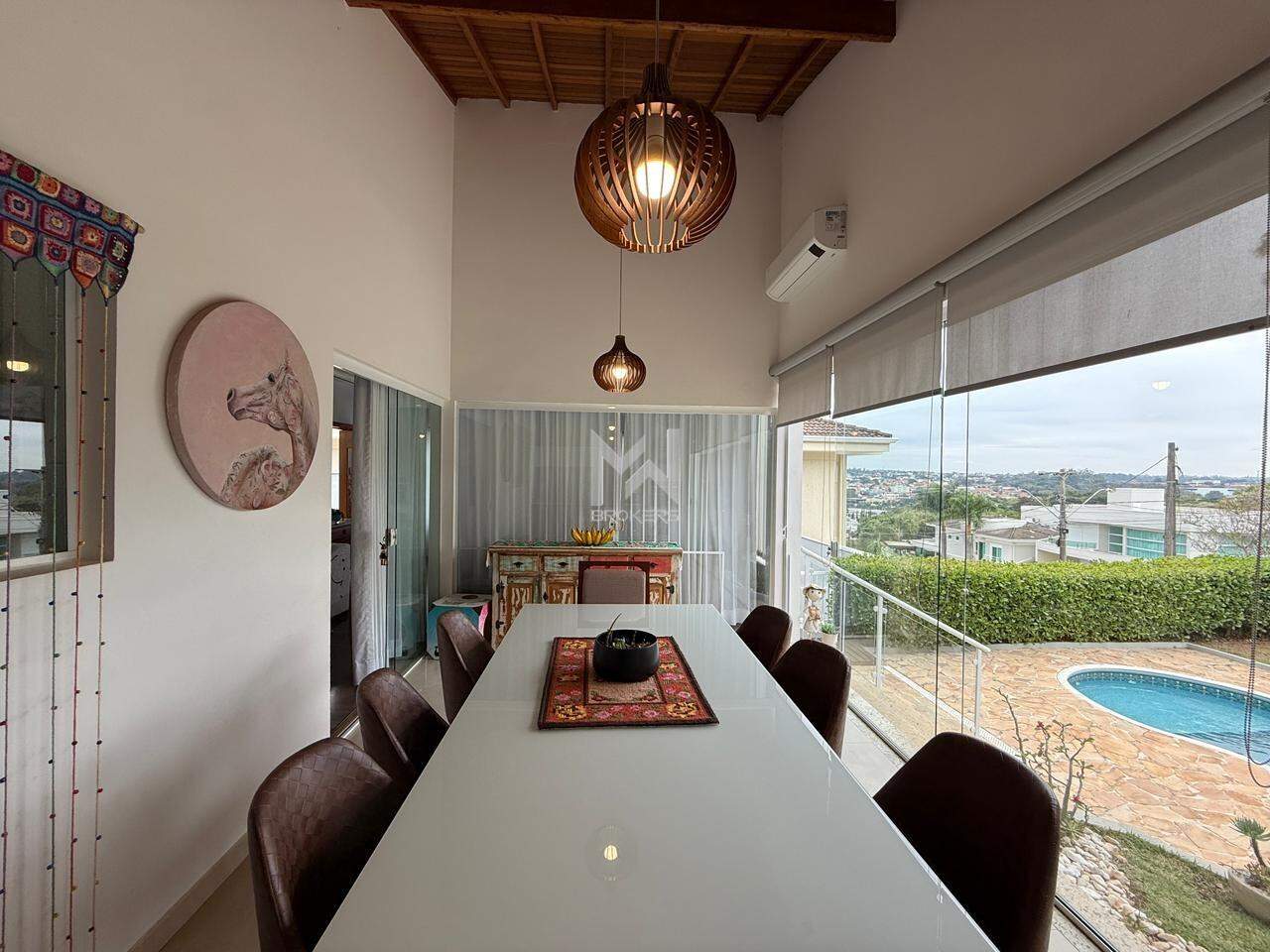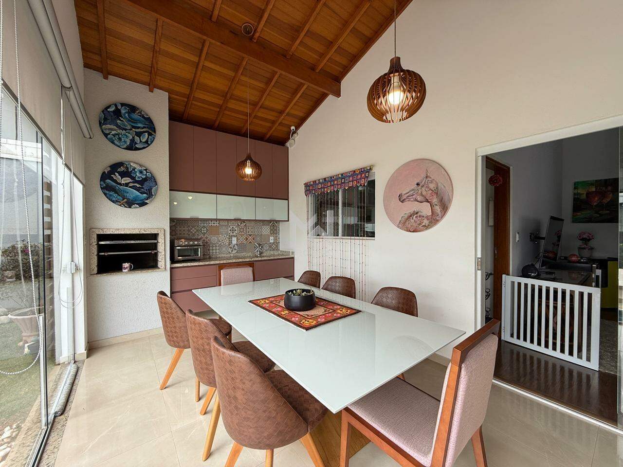 Sala de estar com pé direito alto e lareira, sala de refeições, cozinha com copa, sala íntima, área externa com quintal privativo, espaço gourmet com churrasqueira, jardim, gramado, piscina, atelier e banheiro de apoio.