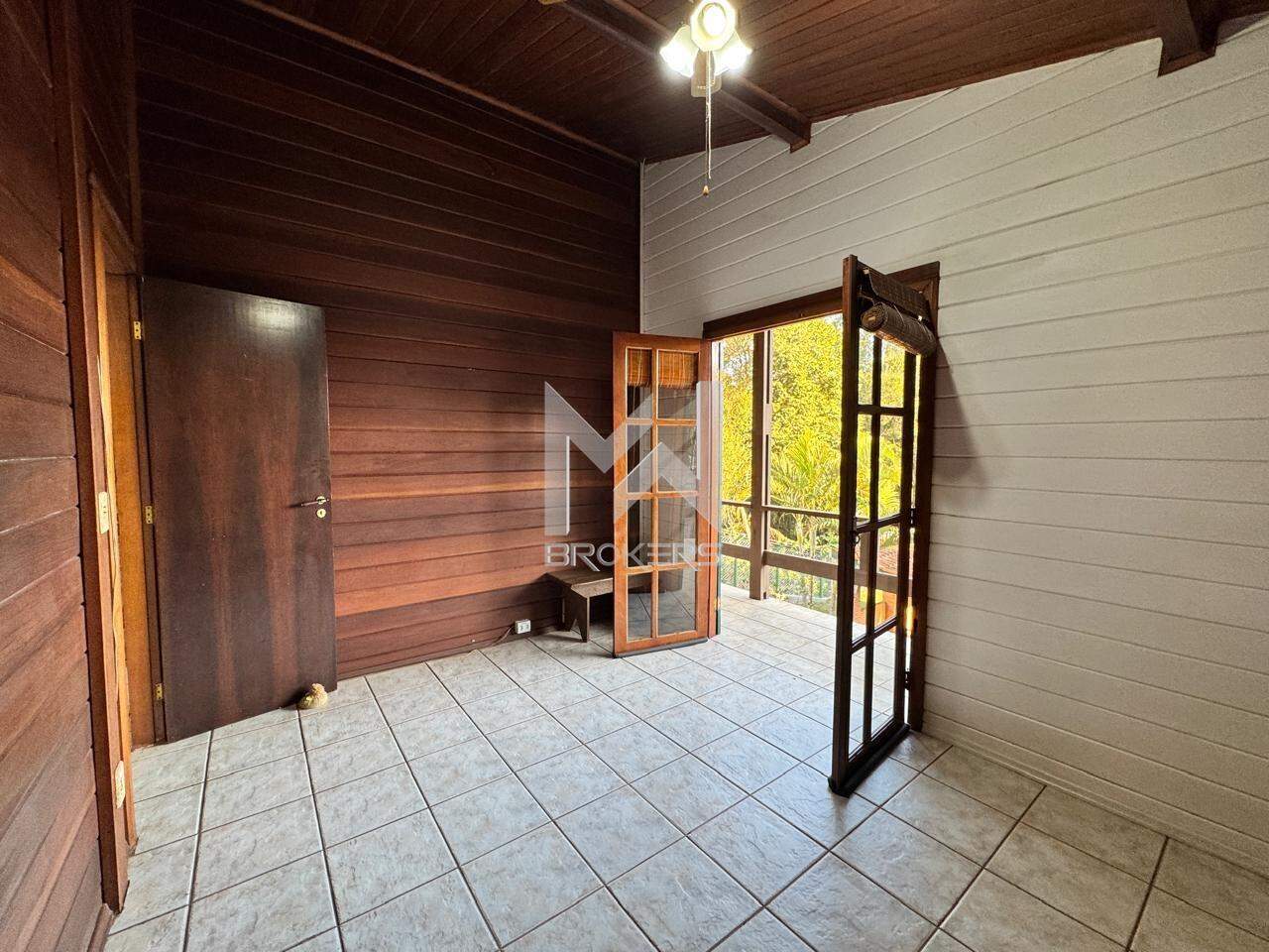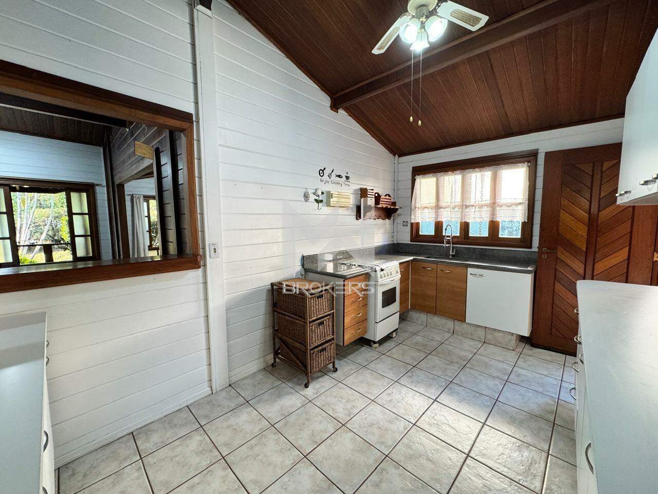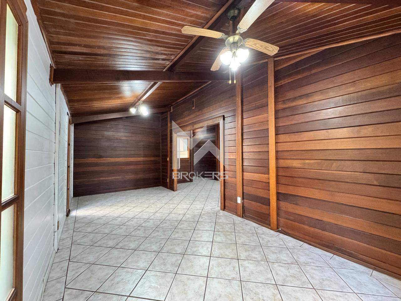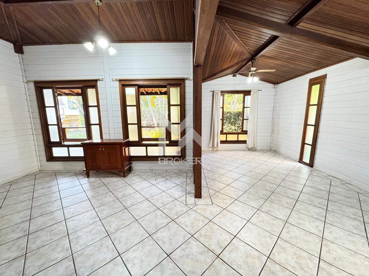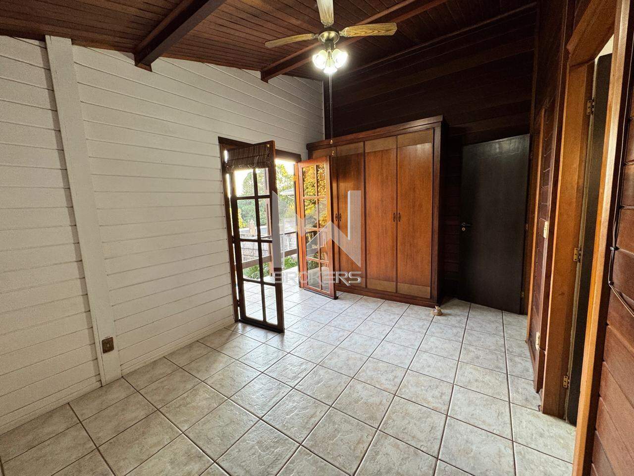 Construída em madeira de lei, a casa oferece fundos sem vizinhos, proporcionando privacidade e contato direto com a natureza. No pavimento inferior, conta com área de lazer completa, piscina, churrasqueira, banheiro de apoio, gramado e amplo quintal. A garagem comporta até 4 veículos, sendo 2 vagas cobertas e 2 descobertas.