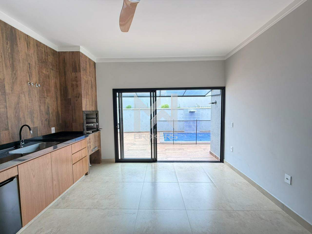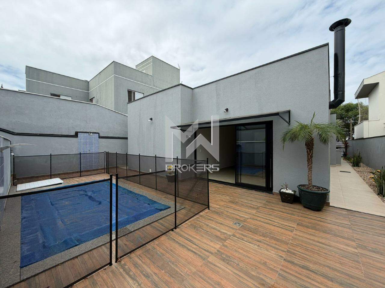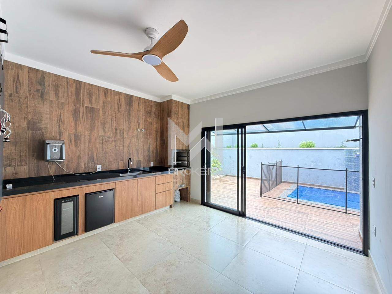Salas de estar e de refeições integradas com pé direito alto, cozinha, área gourmet com banheiro de apoio e quintal com piscina aquecida (solar).
