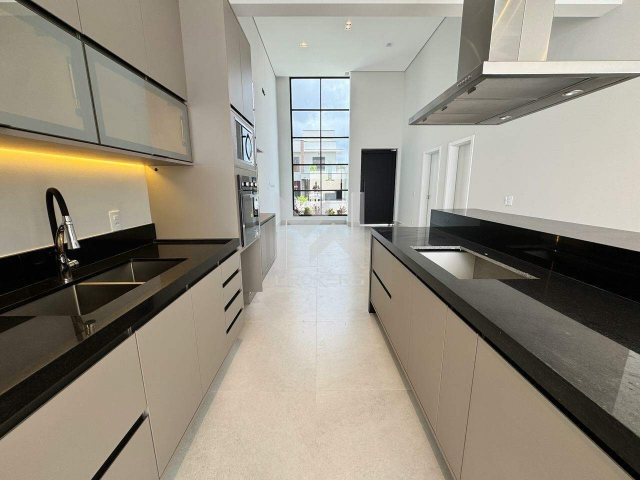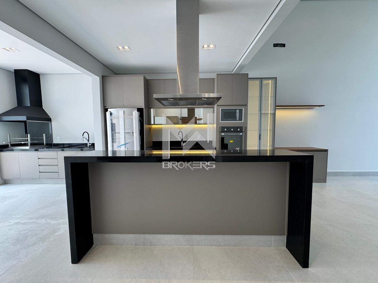 Salas de estar e de refeições integradas, lavabo, escritório, cozinha com planejados, geladeira, forno elétrico, microondas, cooktop e coifa, espaço gourmet com churrasqueira, banheiro de apoio e quintal com paisagismo e piscina.