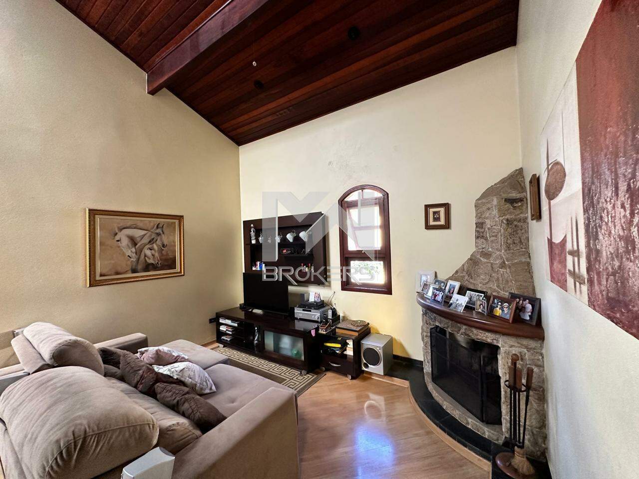 Sala de estar, sala de jantar e sala de TV com lareira. Varanda fechada com vidro com vista para piscina.