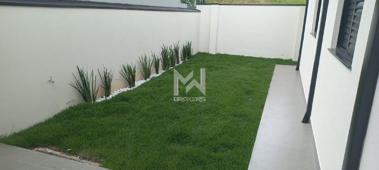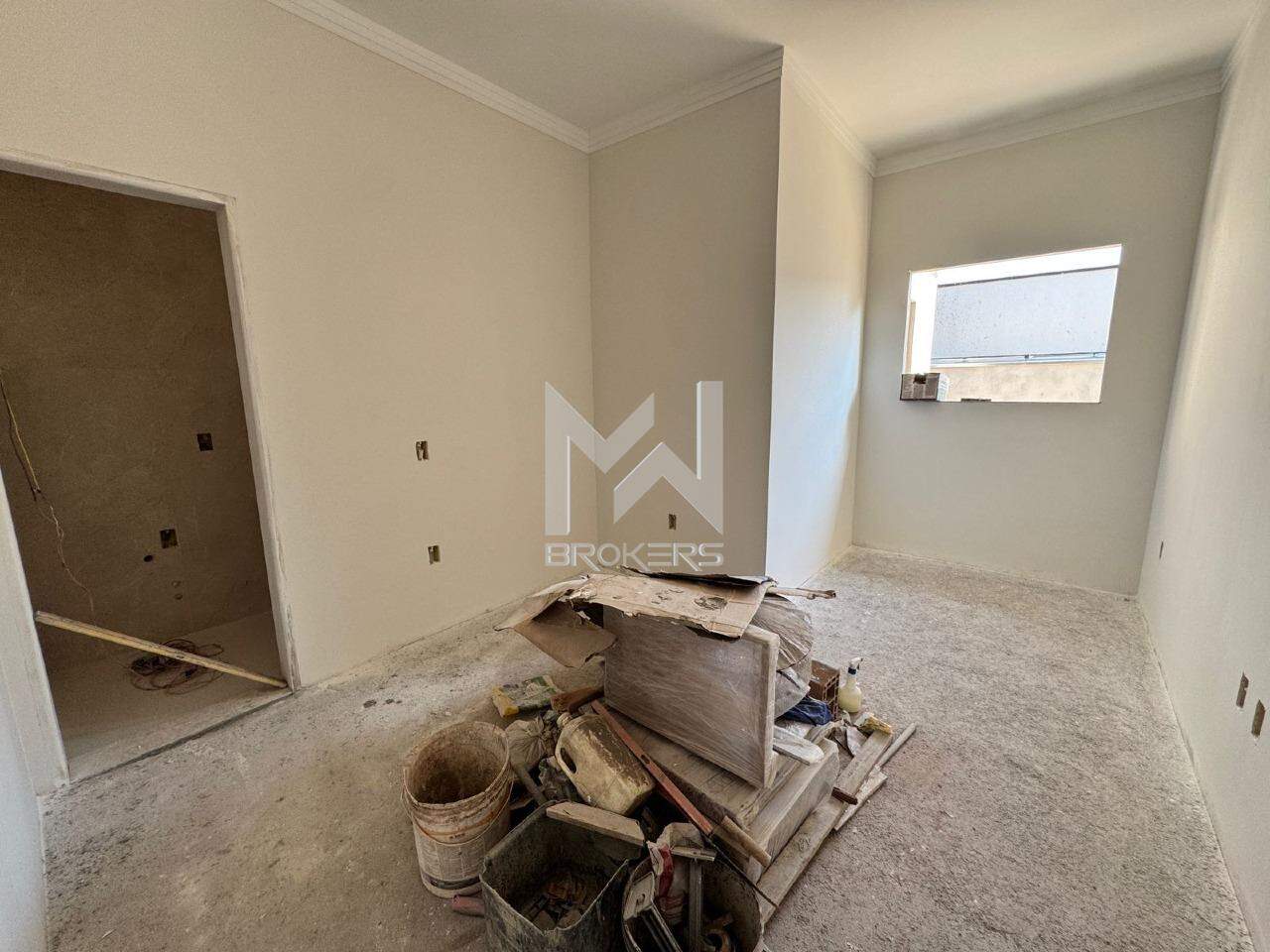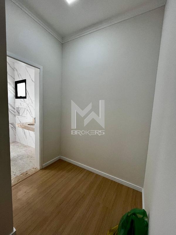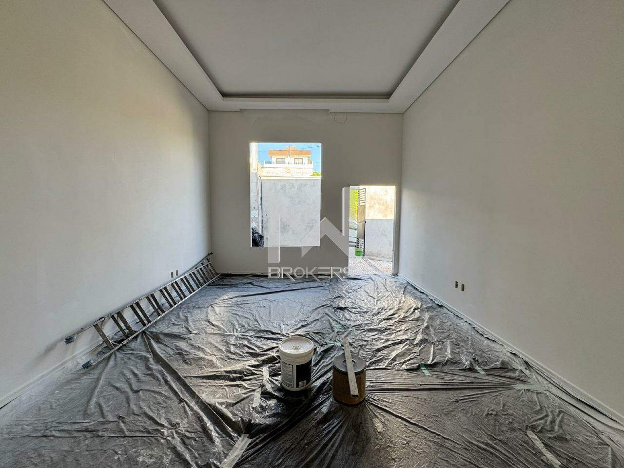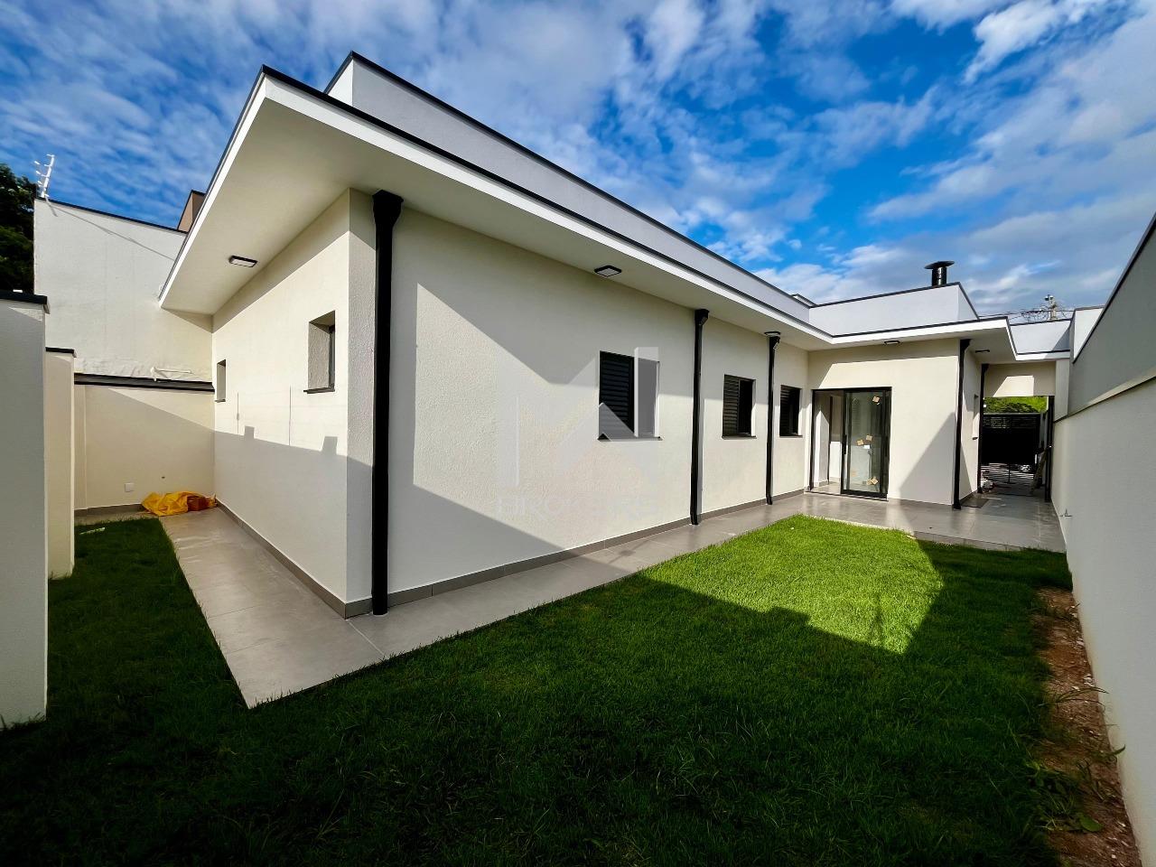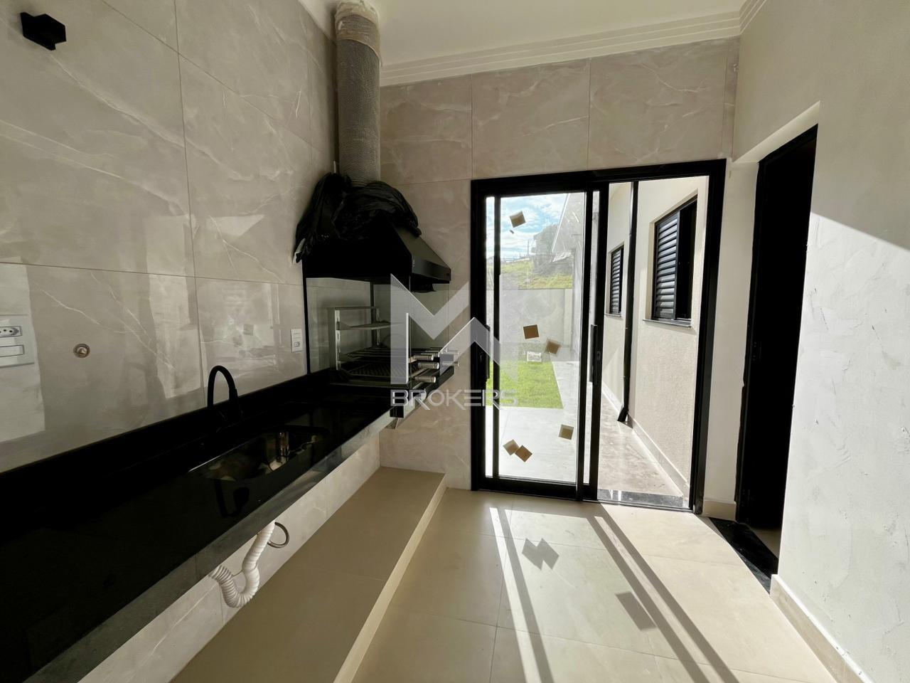 Casa térrea nova em fase final de acabamento à venda no Jardim das Videiras, Vinhedo/SP. O imóvel conta com sala de estar com pé-direito alto e sanca com iluminação indireta, cozinha em porcelanato polido, banheiro social e área de serviço externa.