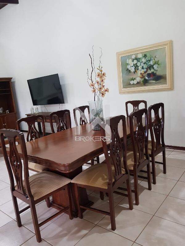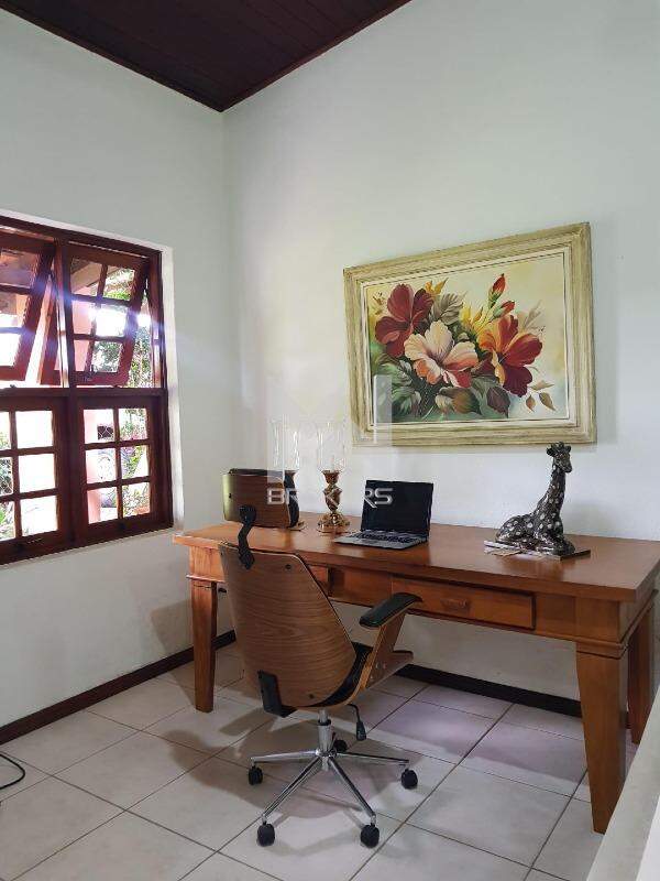 Sala de estar com lareira e sala de refeições integradas com pé direito alto com forro em madeira Jatobá, escritório, sala de TV, banheiro social, cozinha com copa e área de serviços.