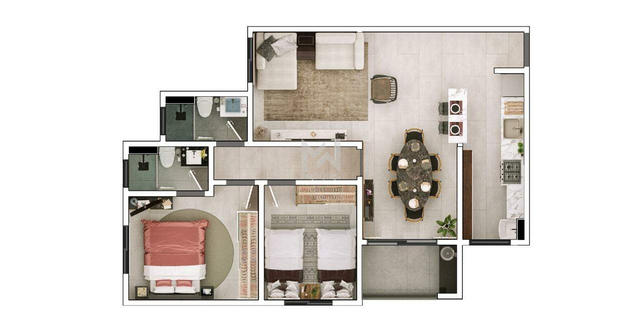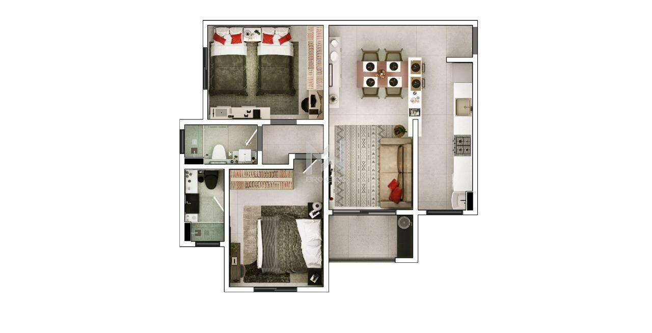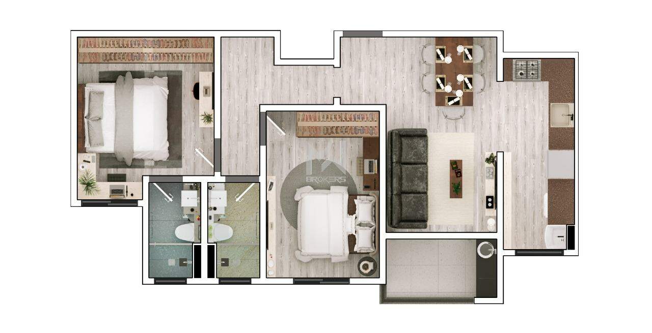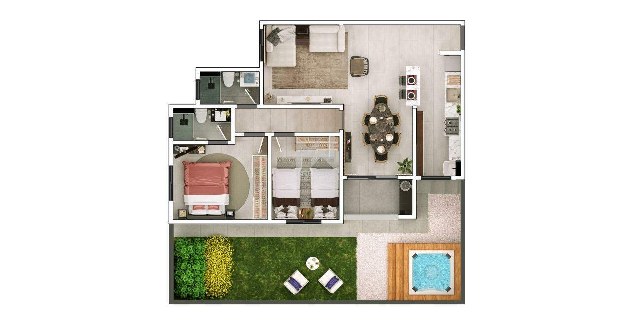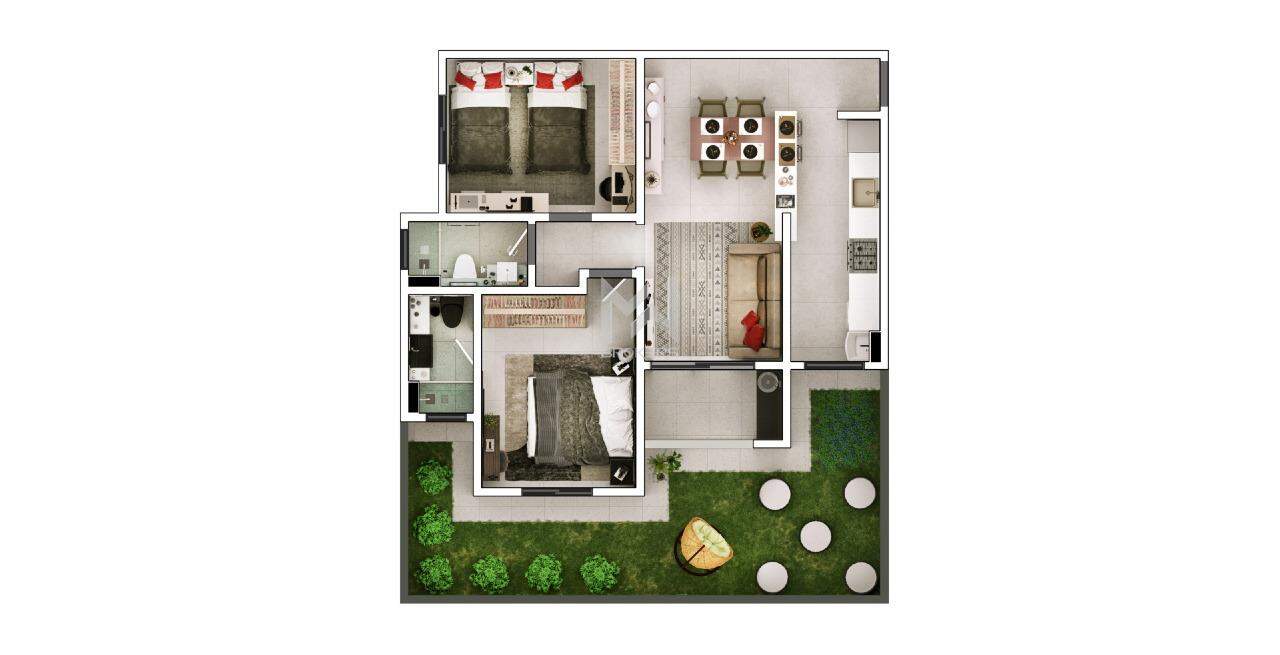 Dois dormitórios, sendo 1 suíte, banheiro social, sala de estar e jantar, cozinha, área de serviço e Garden descoberto.