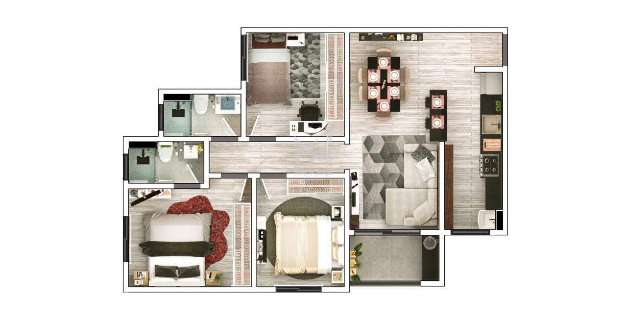 Três dormitórios, sendo 1 suíte, banheiro social, sala de estar e jantar, cozinha, área de serviço e Garden descoberto.