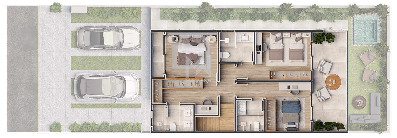 Casas 147m² a 200m², todas as plantas contemplam 03 dormitórios, todos suítes com varanda. Quintal com área gourmet e churrasqueira.