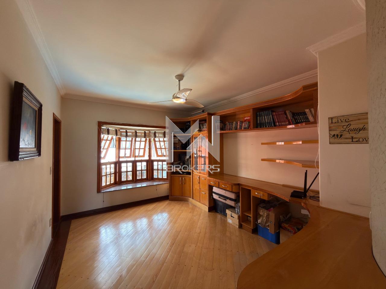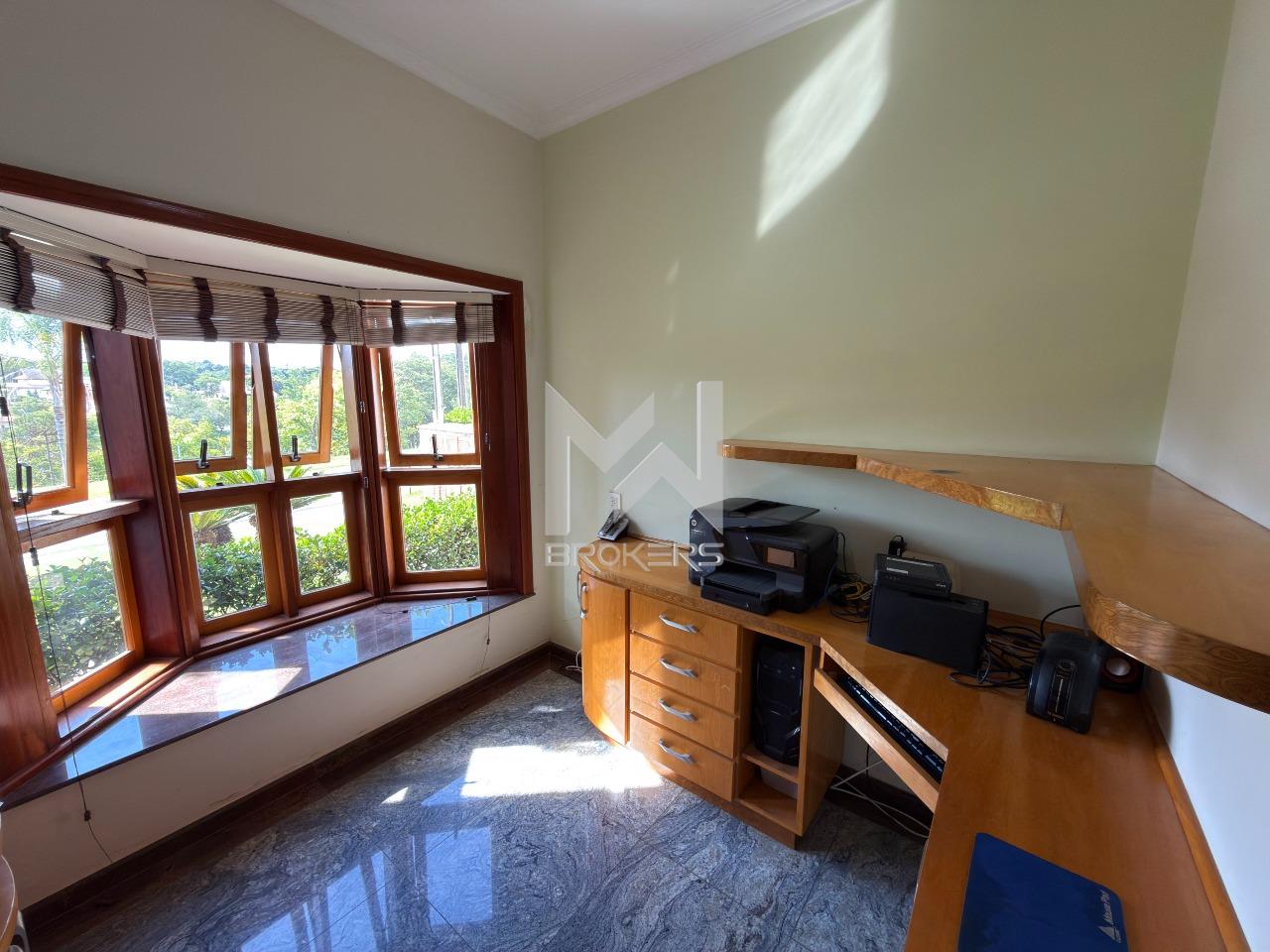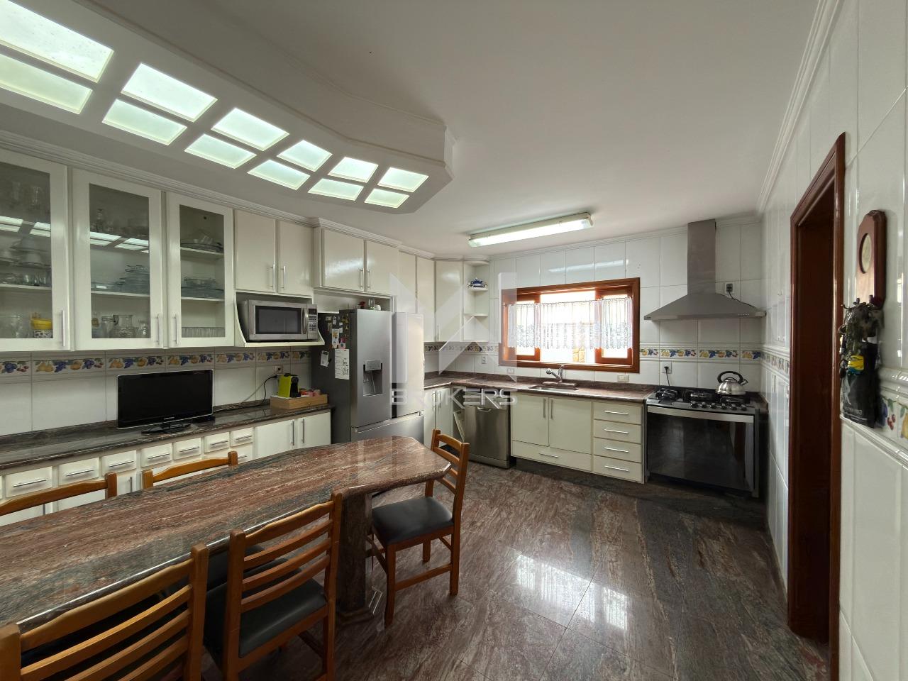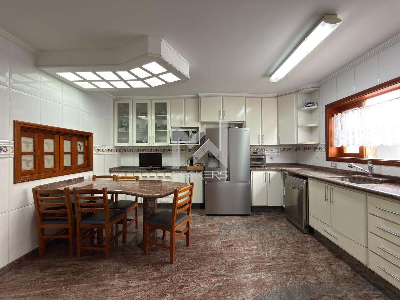 O imóvel dispõe de ampla sala de estar com lareira, lavabo, sala de refeições e sala de TV, além de escritório, ideal para quem trabalha em home office. A cozinha é espaçosa, com despensa, e integrada à área de serviços, que conta com dependência de doméstica.