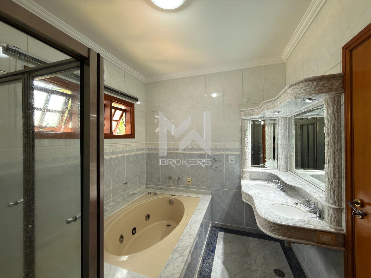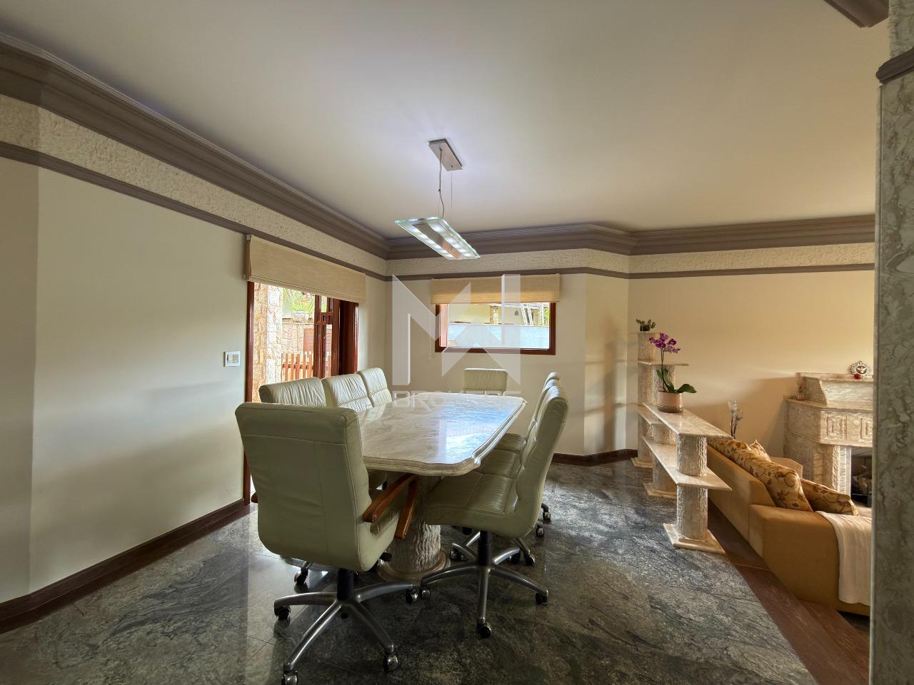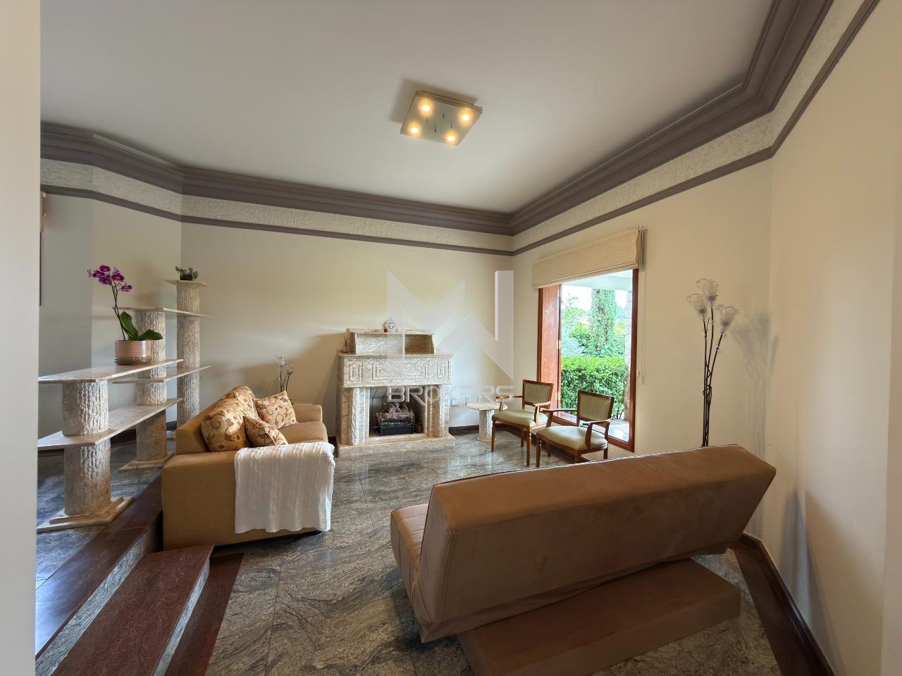O imóvel dispõe de ampla sala de estar com lareira, lavabo, sala de refeições e sala de TV, além de escritório, ideal para quem trabalha em home office. A cozinha é espaçosa, com despensa, e integrada à área de serviços, que conta com dependência de doméstica.
