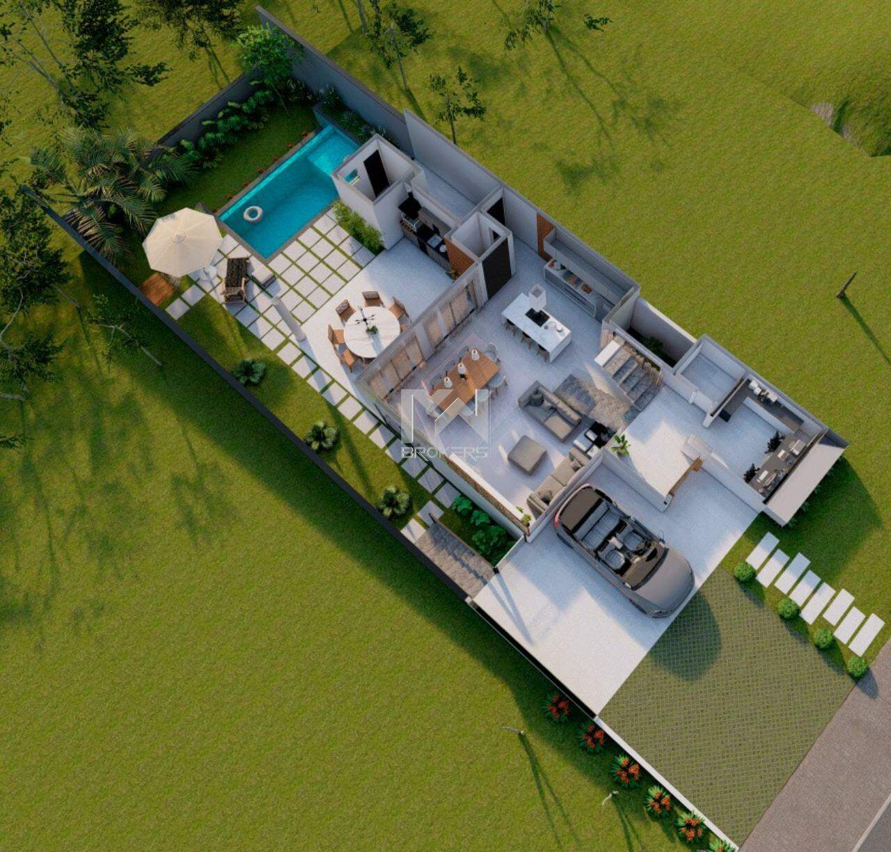 O projeto contempla uma casa estilo sobrado com ambientes amplos e integrados, ideal para quem valoriza conforto, privacidade e uma vista privilegiada: